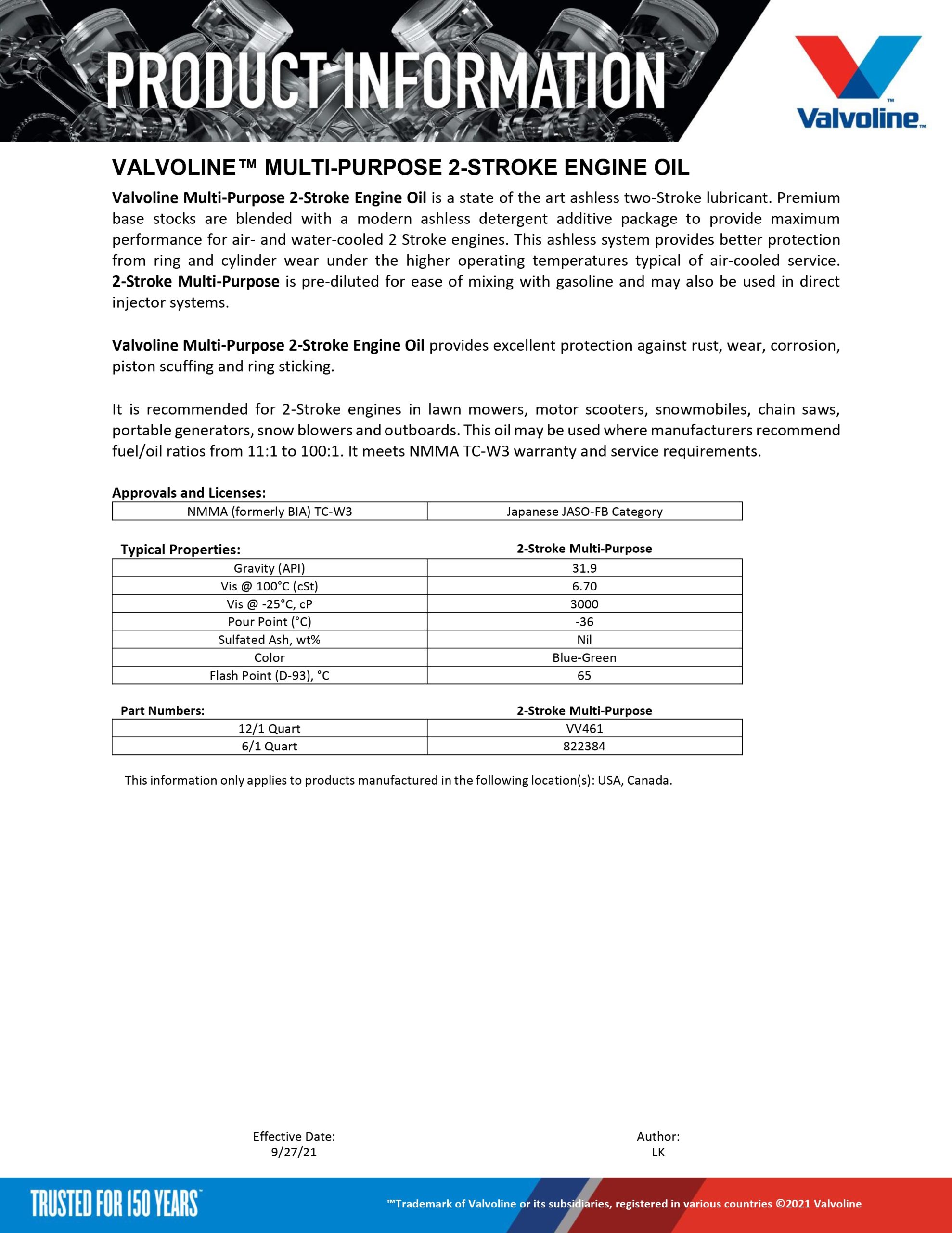 Valvoline Multi-Purpose 2-Stroke Engine Oil is a state of the art ashless two-Stroke lubricant to provide maximum performance for air- and water-cooled 2 Stroke engines.