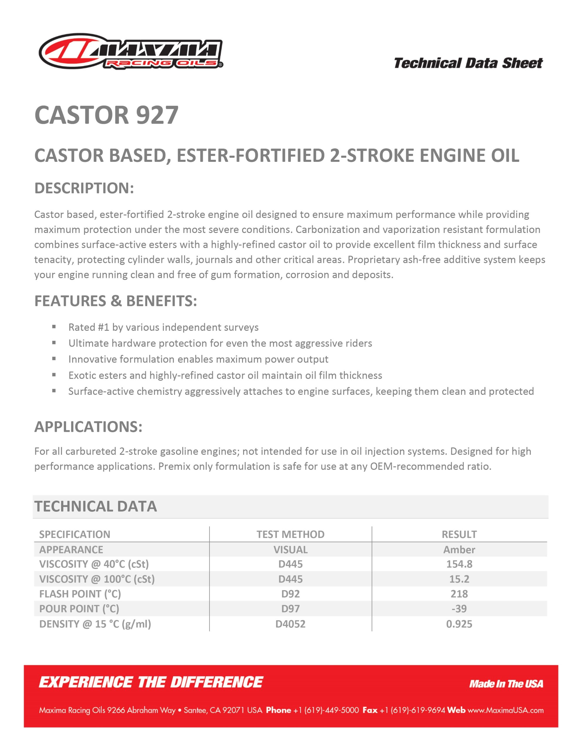 Castor based, ester-fortified 2-stroke engine oil designed to ensure maximum performance while providing maximum protection under the most severe conditions.