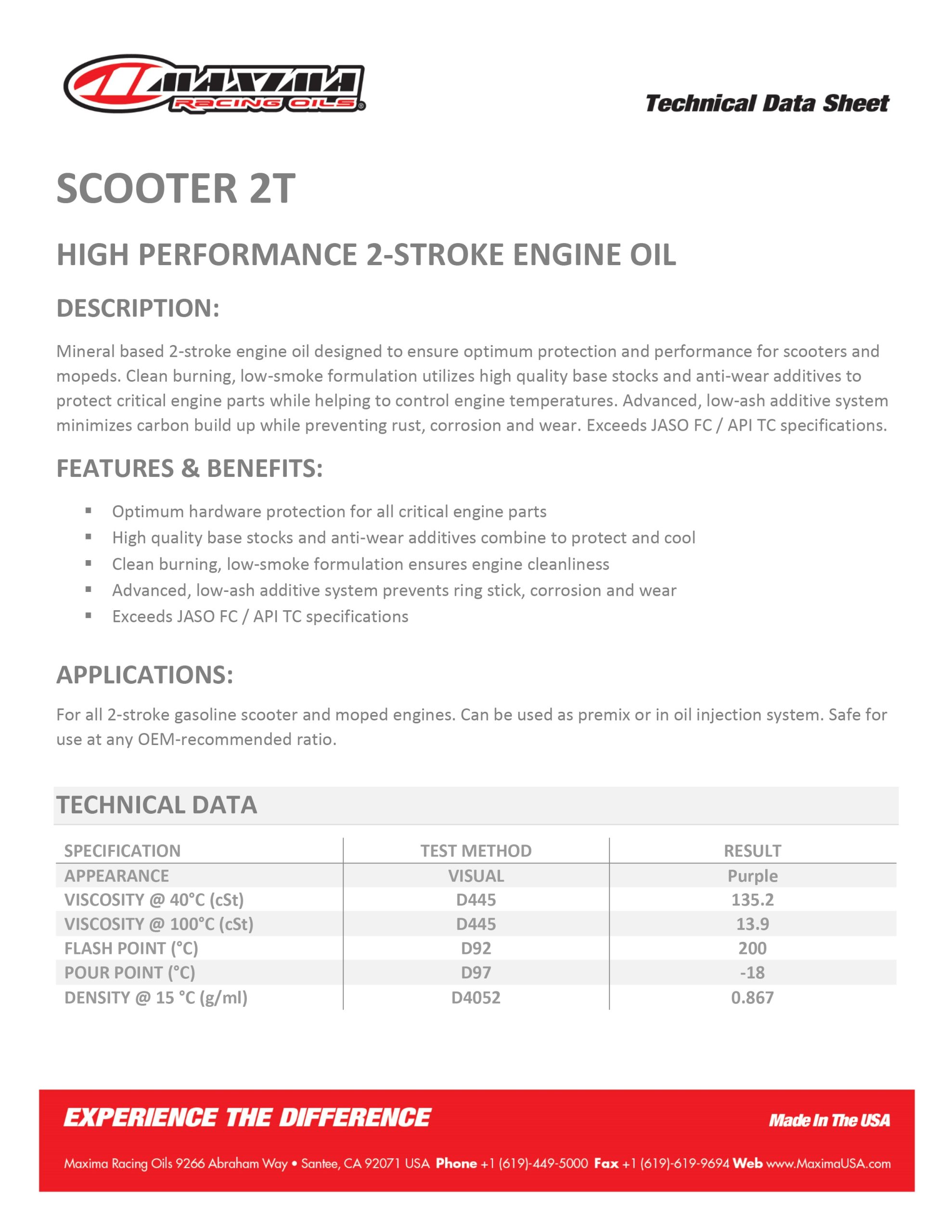 For all 2-stroke gasoline scooter and moped engines. Can be used as premix or in oil injection system. Safe for use at any OEM-recommended ratio.