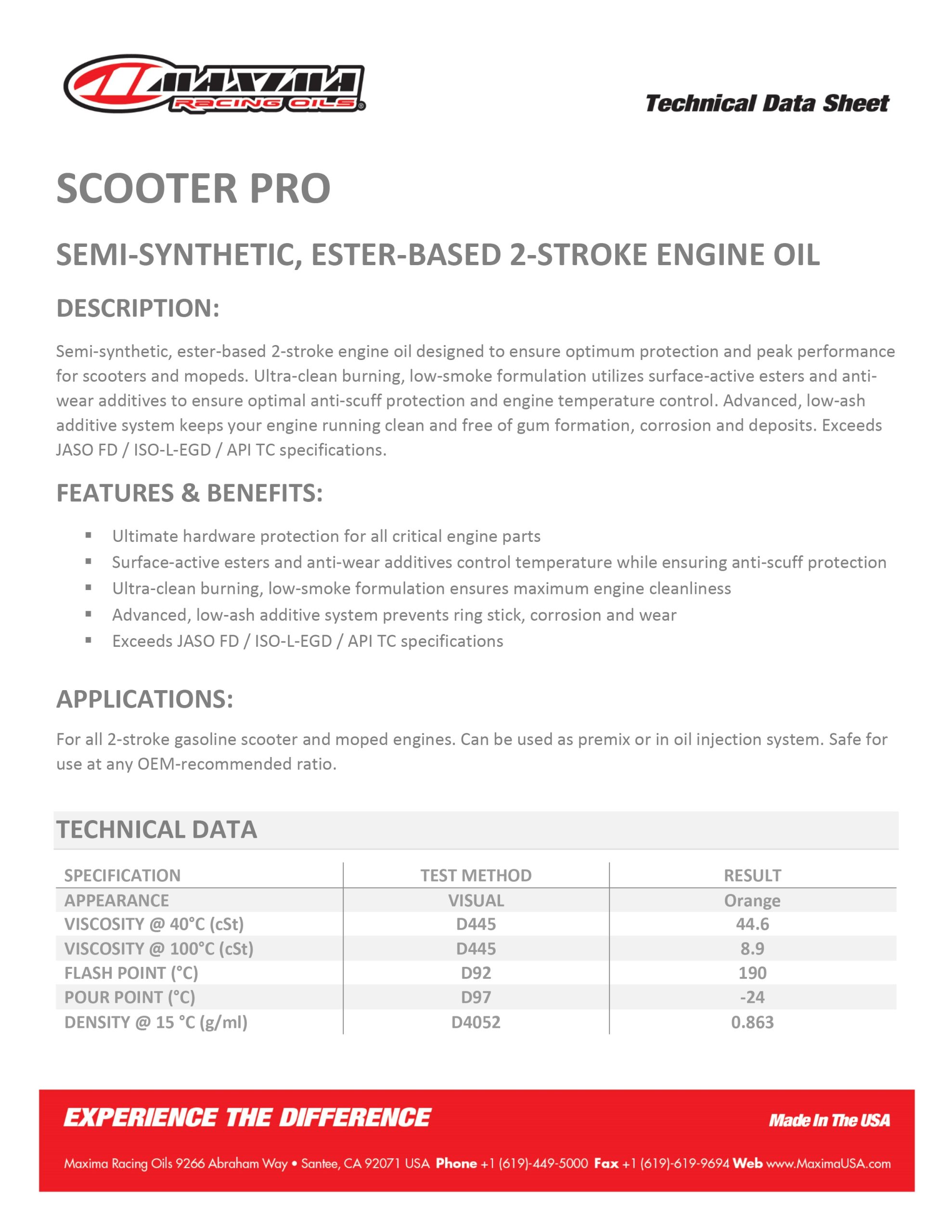 Ultra-clean burning, low-smoke formulation utilizes surface-active esters and anti-wear additives to ensure optimal anti-scuff protection and engine temperature control.