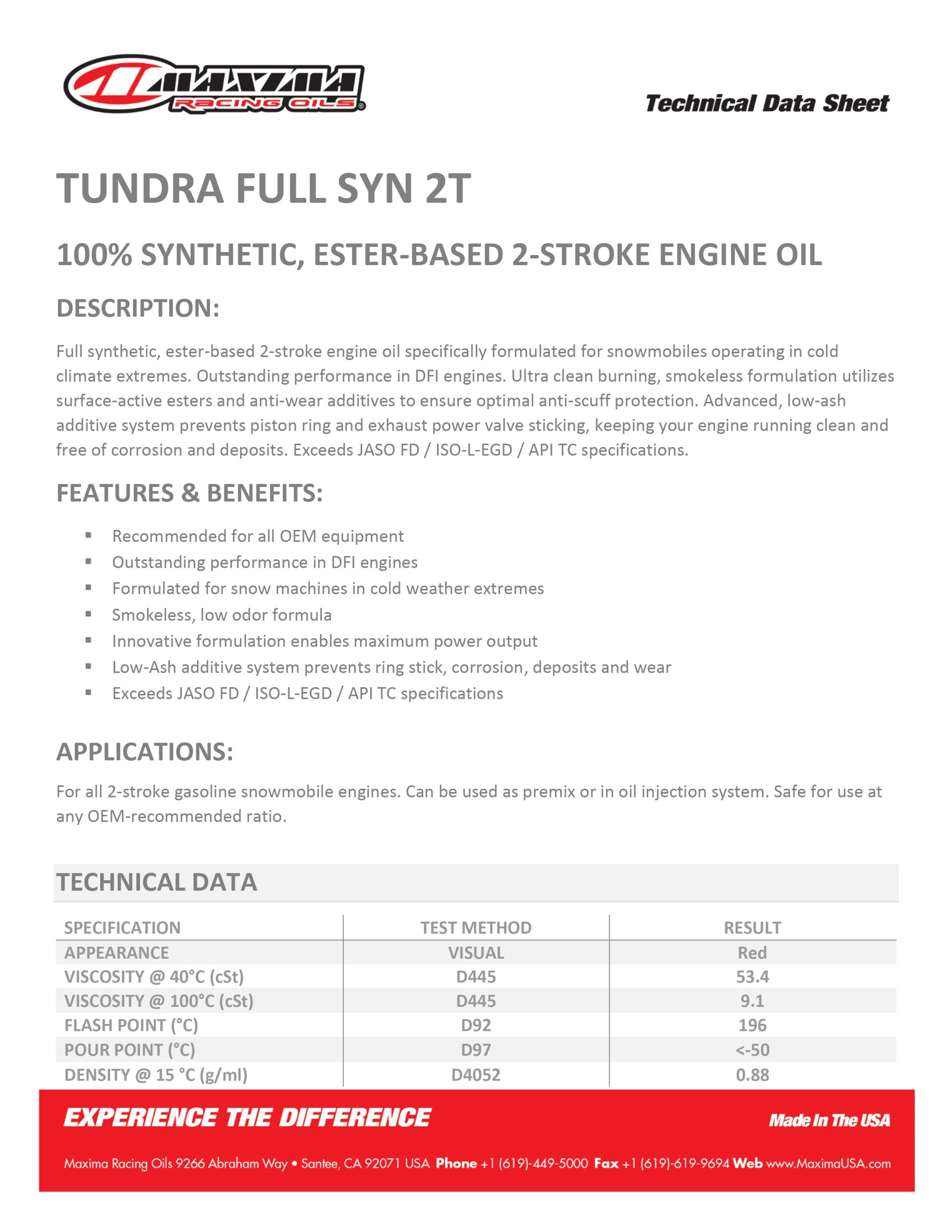 Full synthetic, ester-based 2-stroke engine oil specifically formulated for snowmobiles operating in cold climate extremes. Outstanding performance in DFI engines.
