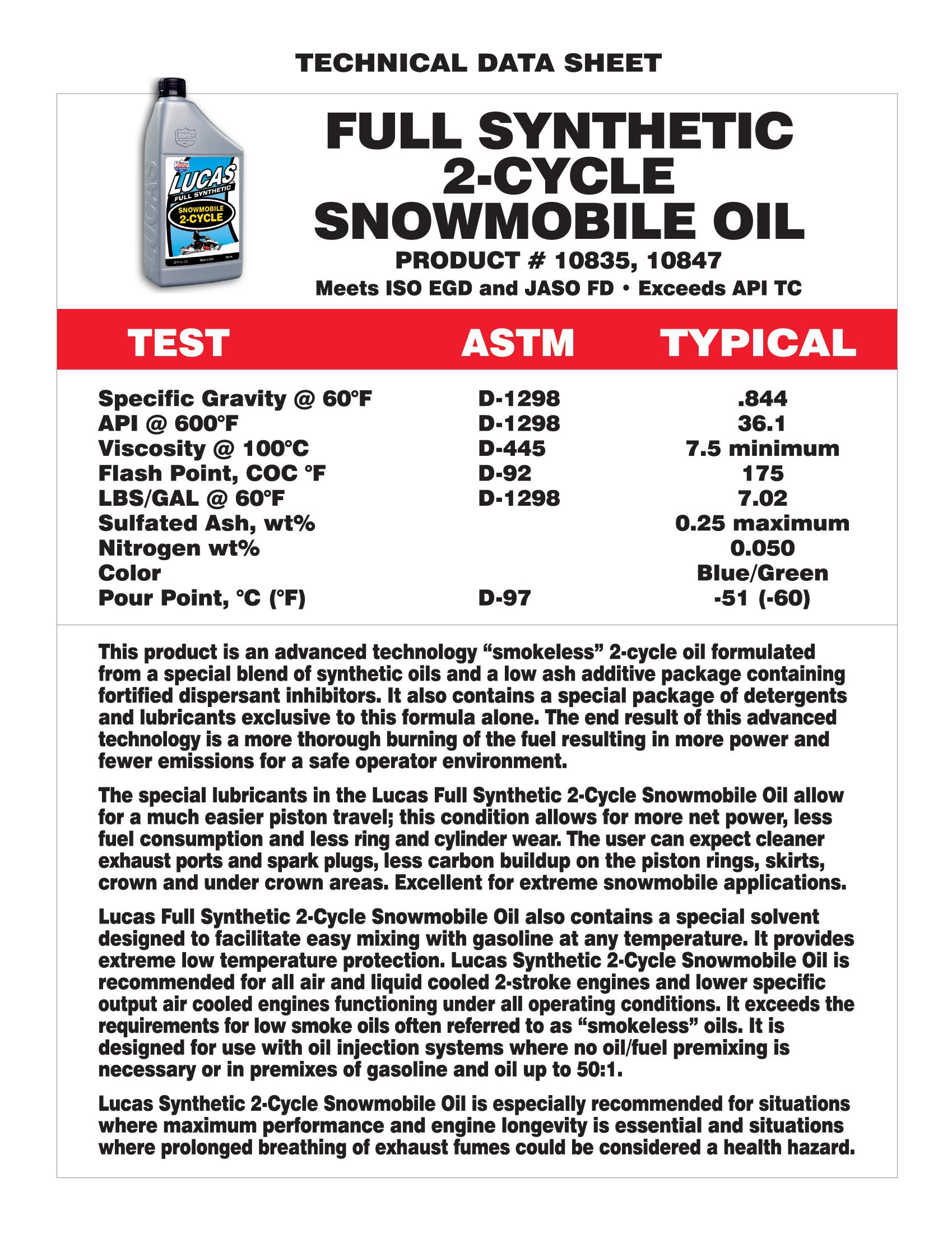 Lucas Synthetic 2-Cycle Snowmobile has been formulated with a special blend of synthetic oils and a low ash additive package containing fortified dispensant inhibitors.