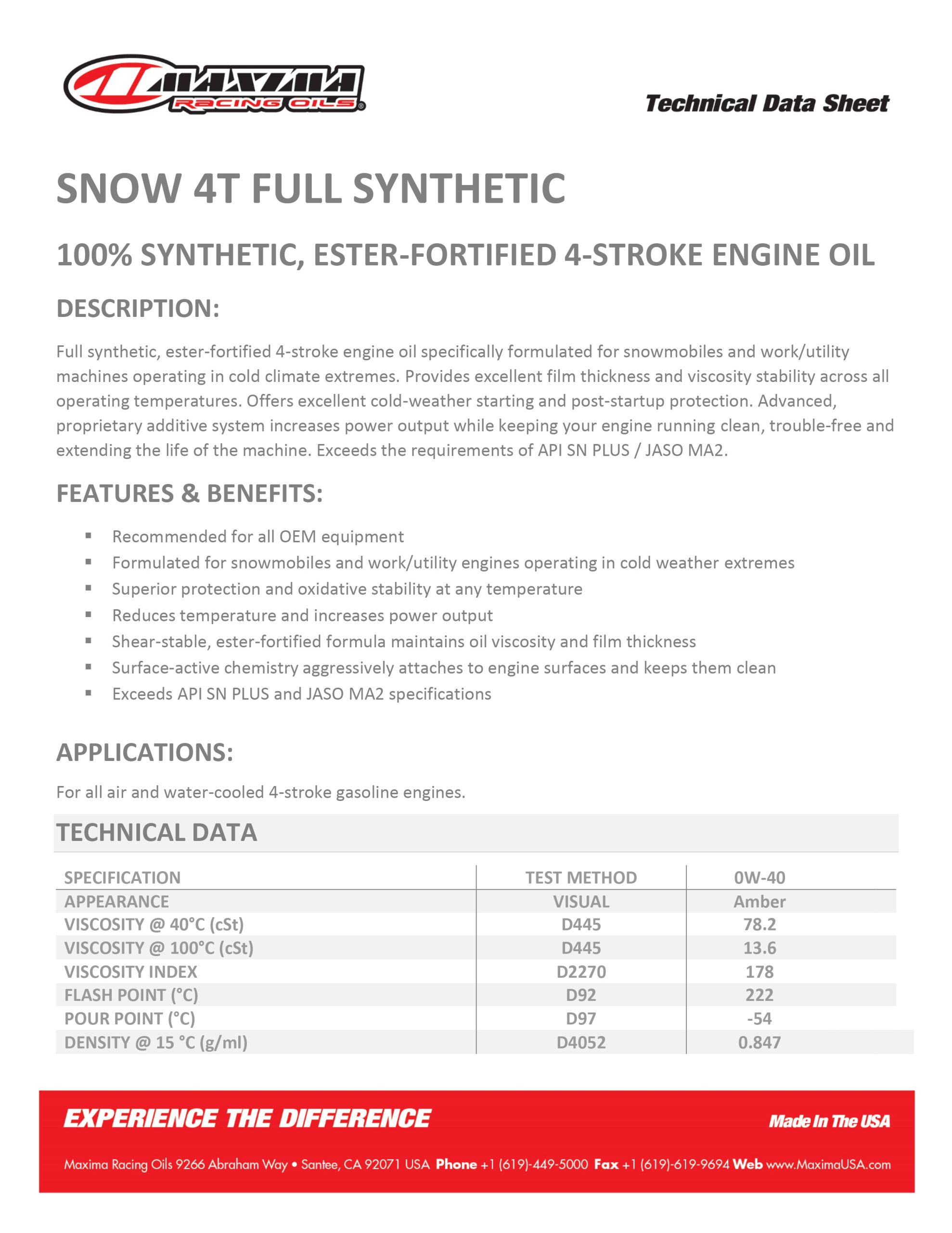 Full synthetic, ester-fortified 4-stroke engine oil specifically formulated for snowmobiles and work/utility machines operating in cold climate extremes.