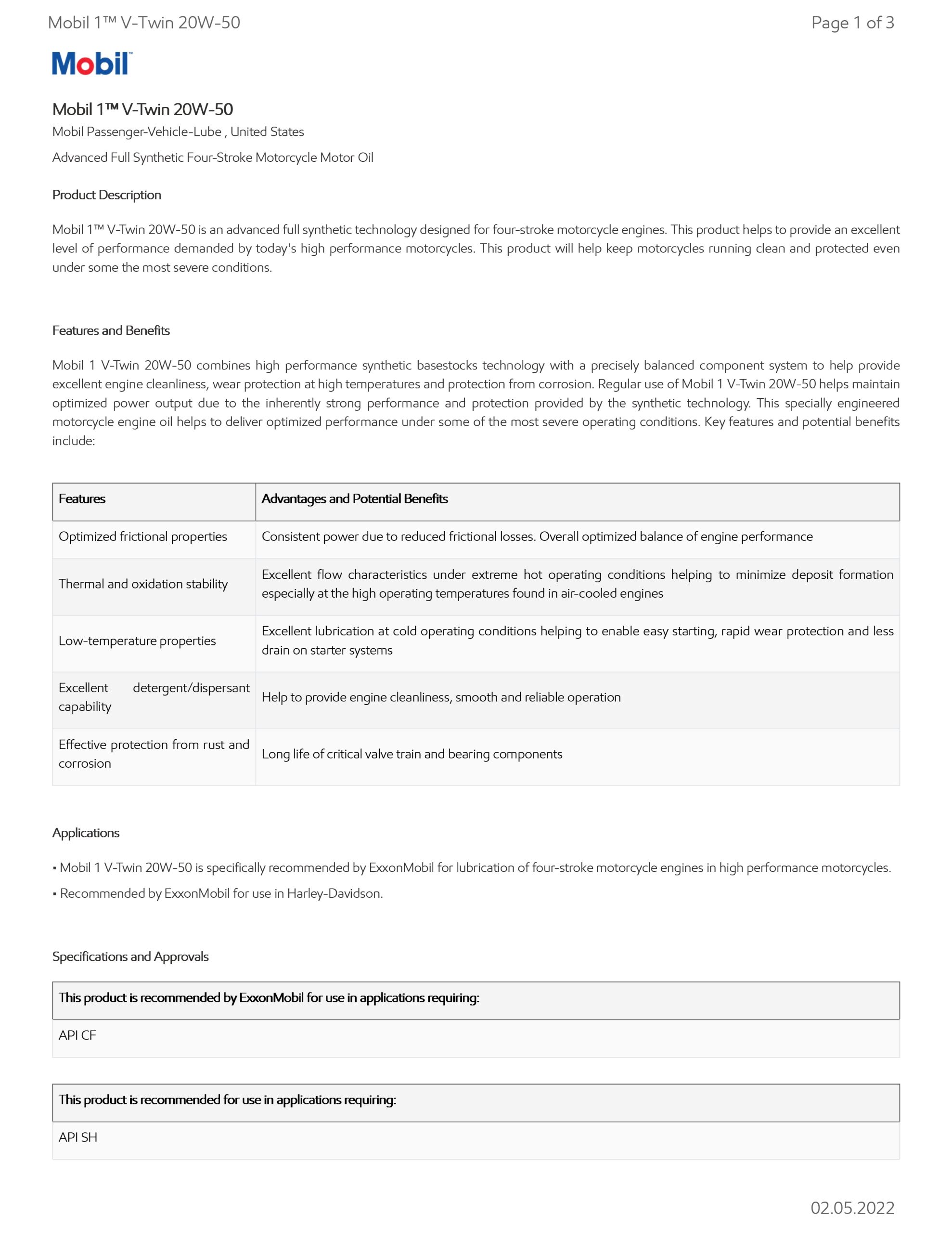 Mobil 1 V-Twin 20W-50 is specifically recommended by ExxonMobil for lubrication of four-stroke motorcycle engines in high performance motorcycles.
