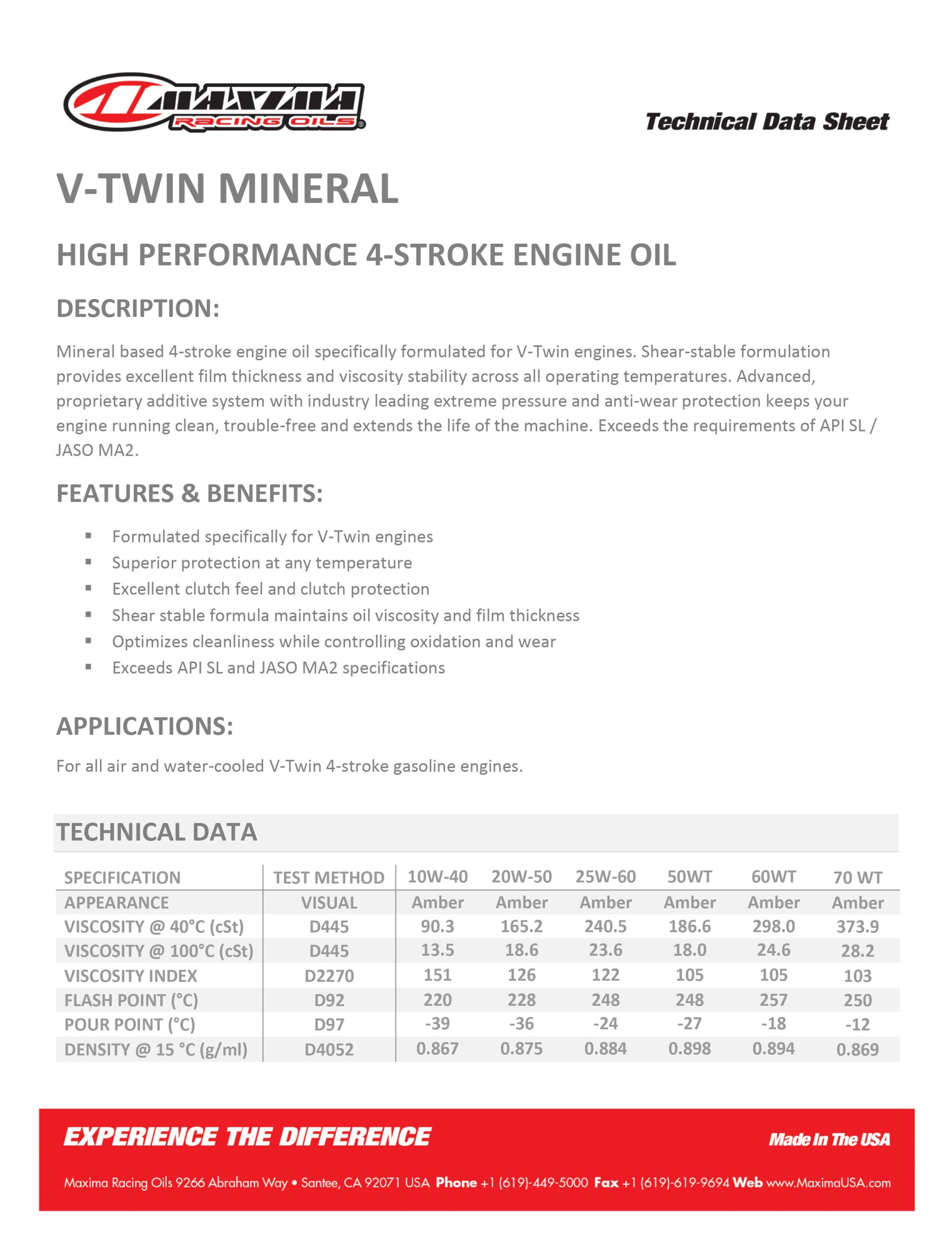 Mineral based 4-stroke engine oil specifically formulated for V-Twin engines.