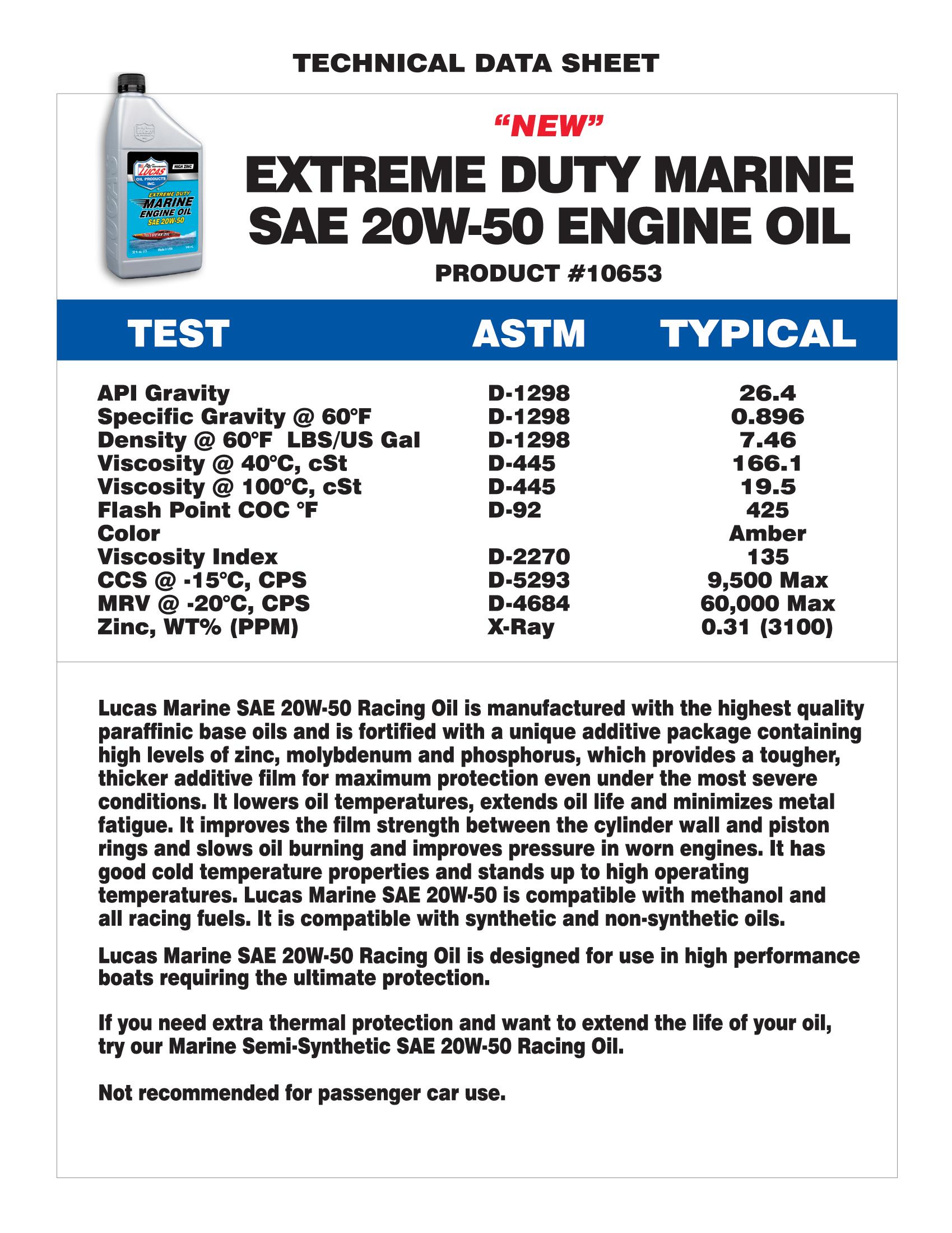 Lucas Extreme Duty Marine SAE 20W-50 Engine Oil is manufactured with the highest quality paraffinic base oils and is fortified with an exclusive additive package containing high levels of Zinc, Moly and Phosphorus that provides a tougher, thicker additive film for maximum protection even under the most sever conditions. It lowers oil temperatures, extends oil life and minimizes metal fatigue.