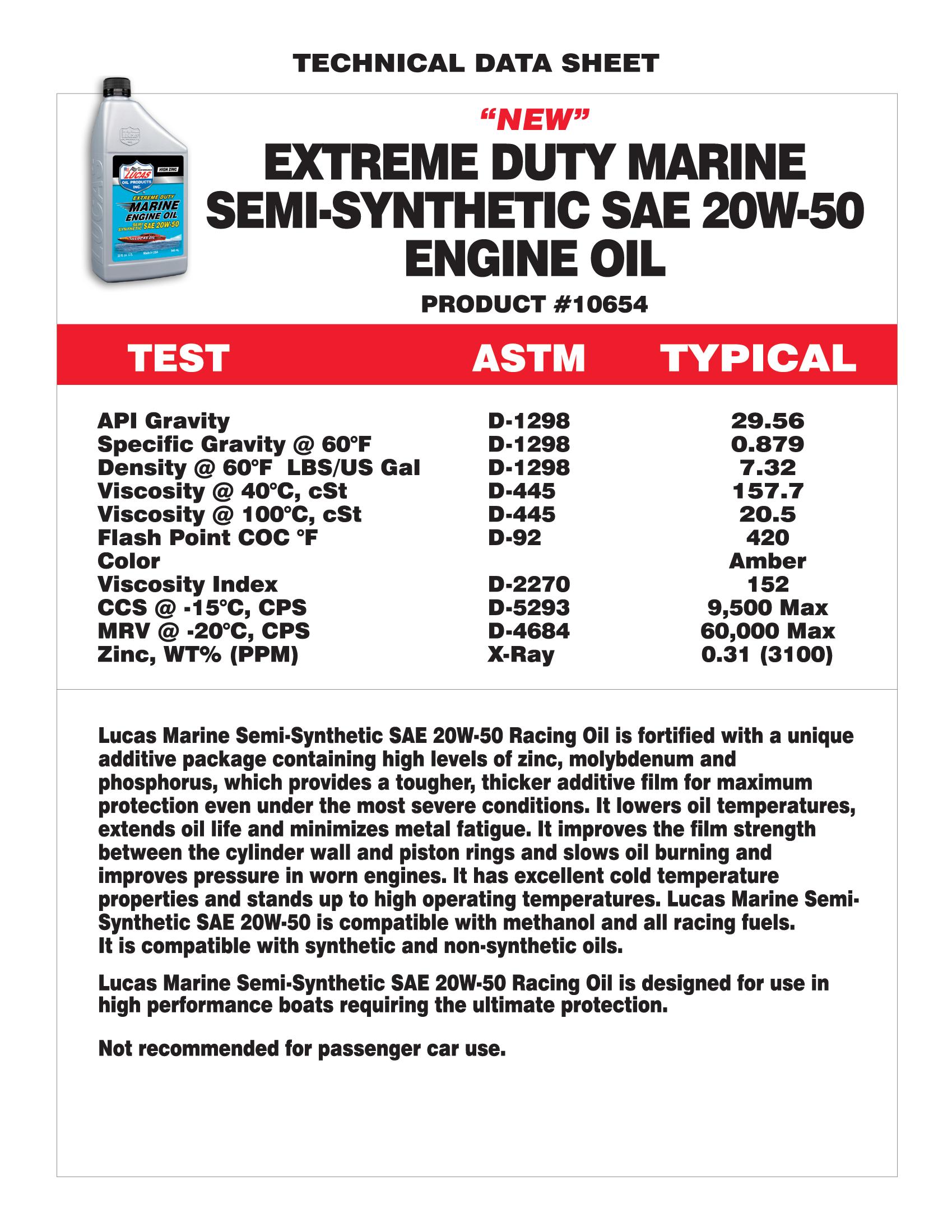 Lucas Extreme Duty Marine Semi Synthetic 20W-50 Engine Oil is manufactured with the highest quality paraffinic base oils and is fortified with an exclusive additive package containing high levels of Zinc, Moly and Phosphorus that provides a tougher, thicker additive film for maximum protection even under the most sever conditions.