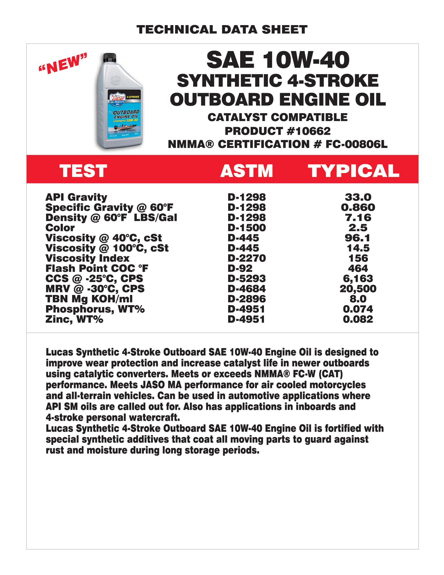 Lucas Synthetic SAE 10W-40 Outboard Engine Oil is formulated especially for the harsh conditions of high speed watercrafts. These outboard engine oils are catalyst compatible and designed for 4-Stroke applications but also work well in Inboards and Personal Watercrafts.