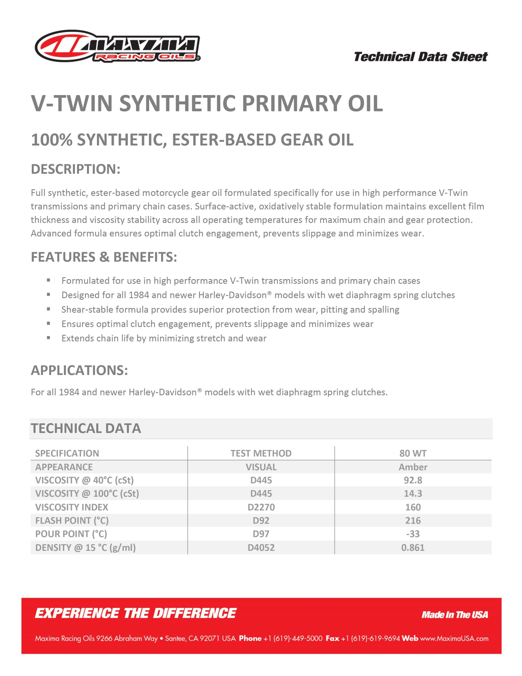 - Formulated for use in high performance V-Twin transmissions and primary chain cases.