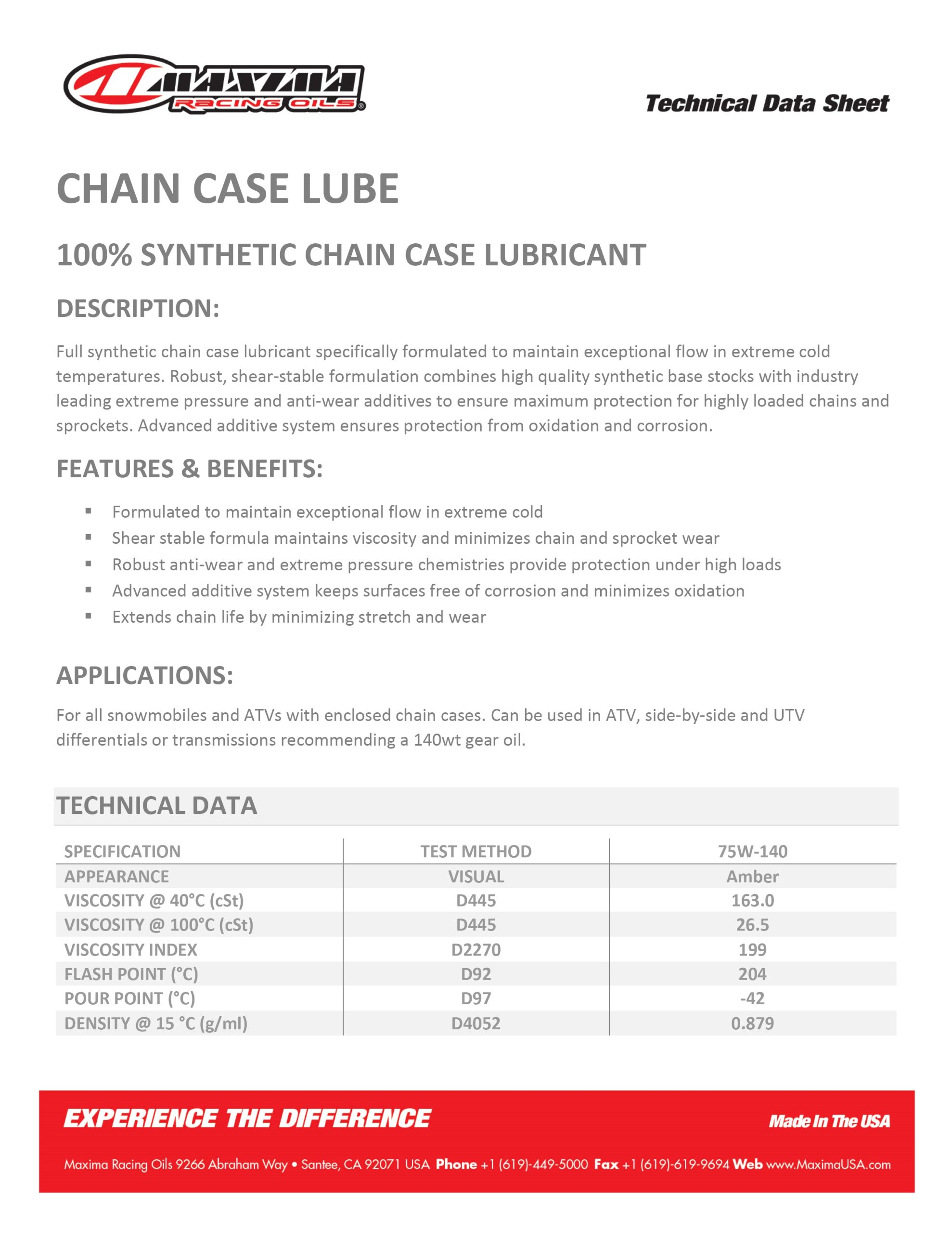 Full synthetic chain case lubricant specifically formulated to maintain exceptional flow in extreme cold temperatures.