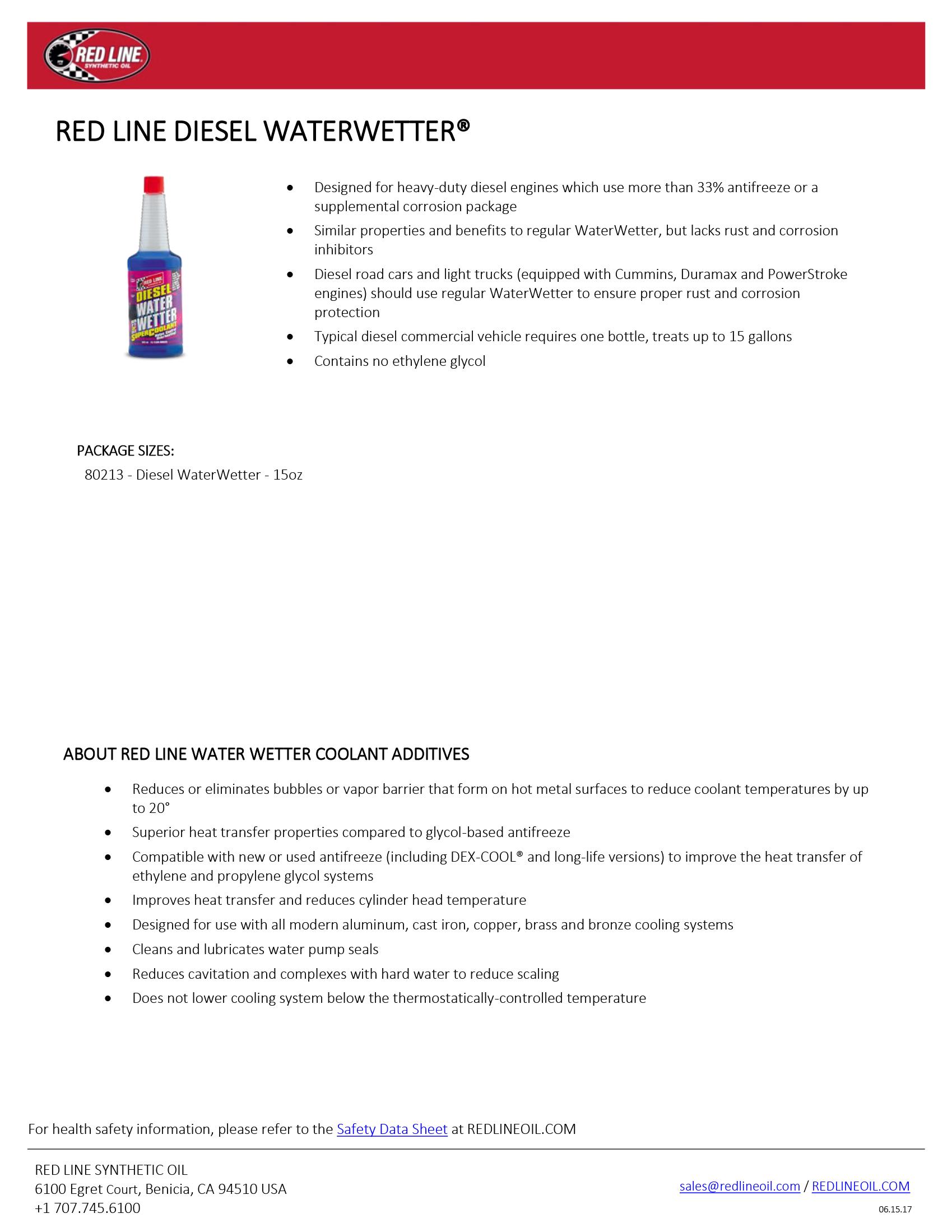 Designed for heavy-duty diesel engines which use more than 33% antifreeze or a supplemental corrosion package. Diesel road cars and light trucks (equipped with Cummins, Duramax, and Power Stroke engines) should use regular Water Wetter to ensure proper rust and corrosion protection.