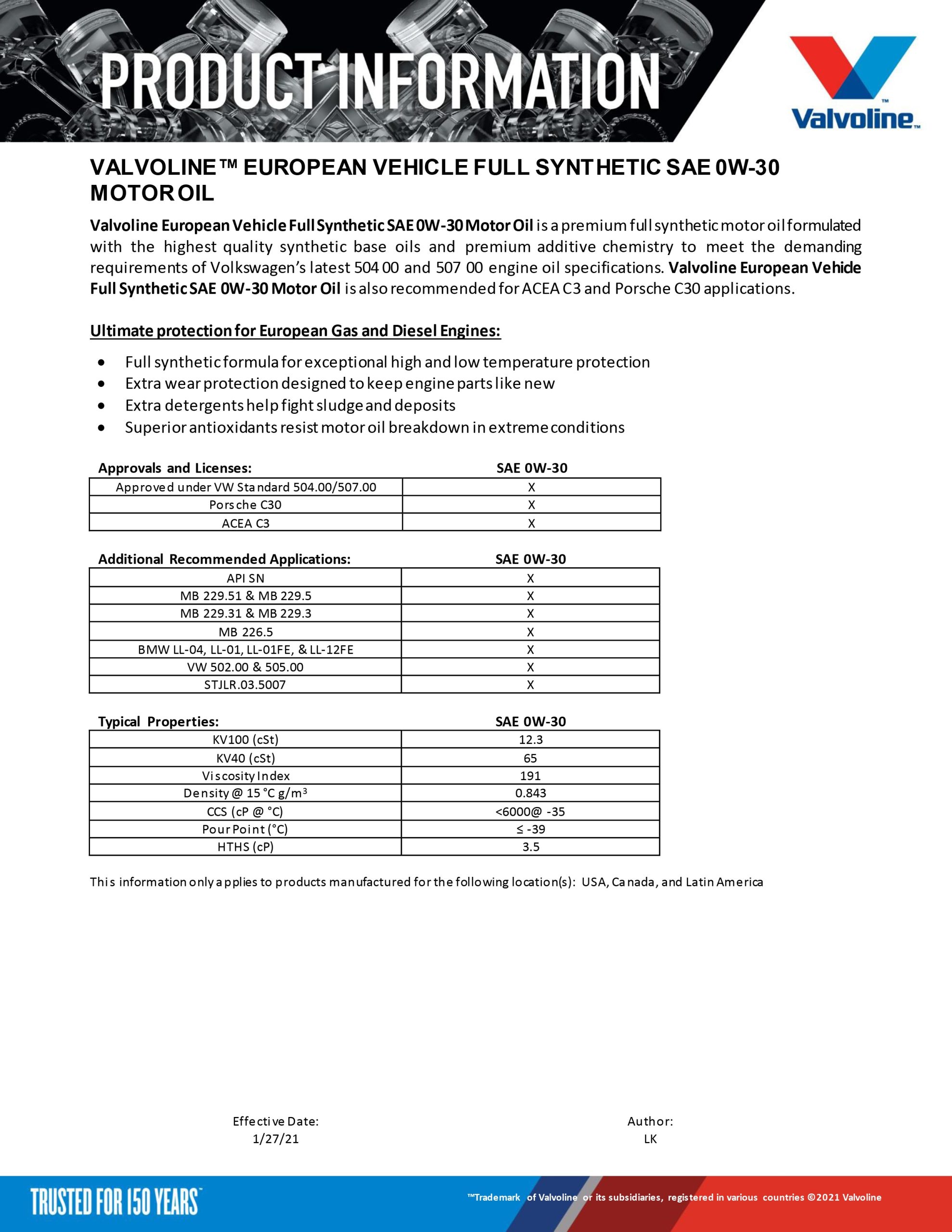 Valvoline European Vehicle Full Synthetic SAE 0W-30 Motor Oil is a premium full synthetic motor oil formulated with the highest quality synthetic base oils and premium additive chemistry to meet the demanding requirements of Volkswagens latest 504 00 and 507 00 engine oil specifications. Valvoline European Vehicle Full Synthetic SAE 0W-30 Motor Oil is also recommended for ACEA C3 and Porsche C30 applications.