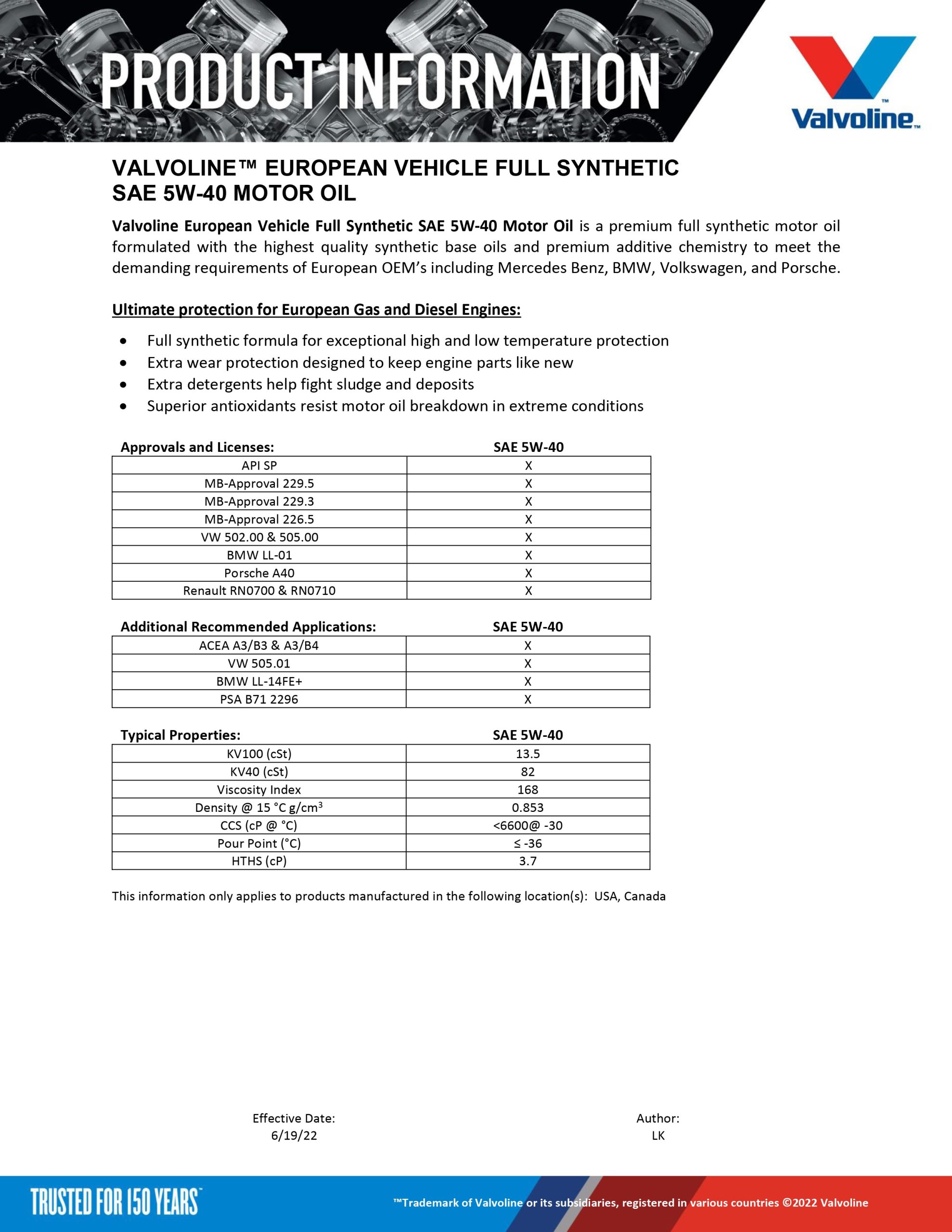 Valvoline European Vehicle Full Synthetic SAE 5W-40 Motor Oil is a premium full synthetic motor oil formulated with the highest quality synthetic base oils and premium additive chemistry to meet the demanding requirements of European OEMs including Mercedes Benz, BMW, Volkswagen, and Renault.