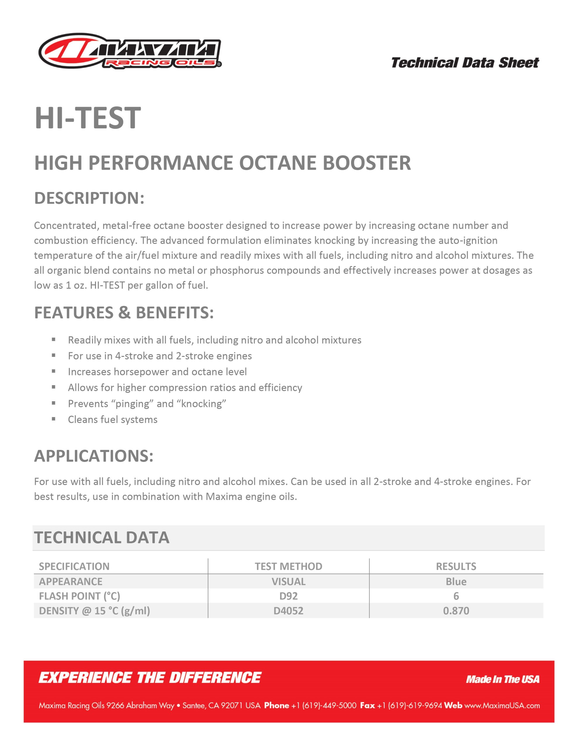 The all organic blend contains no metal or phosphorus compounds and effectively increases power at dosages as low as 1 oz. HI-TEST per gallon of fuel.