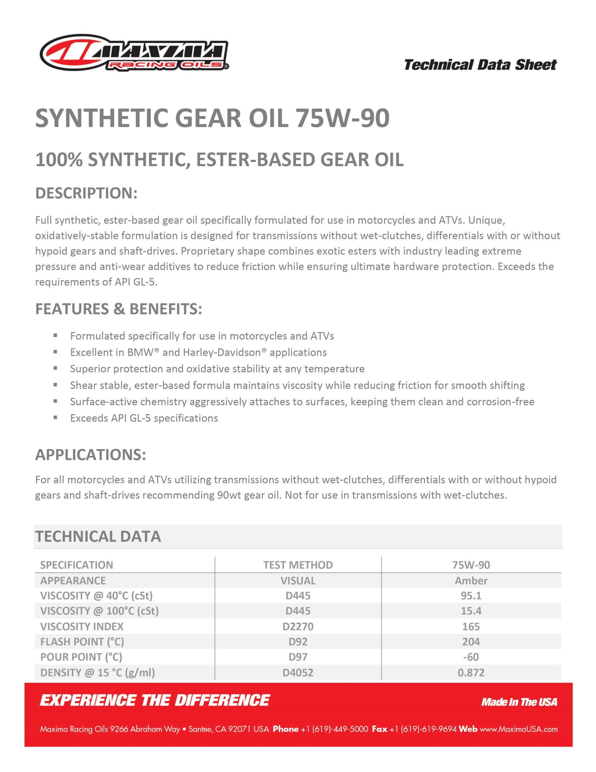 Full synthetic, ester-based gear oil specifically formulated for use in motorcycles and ATVs.