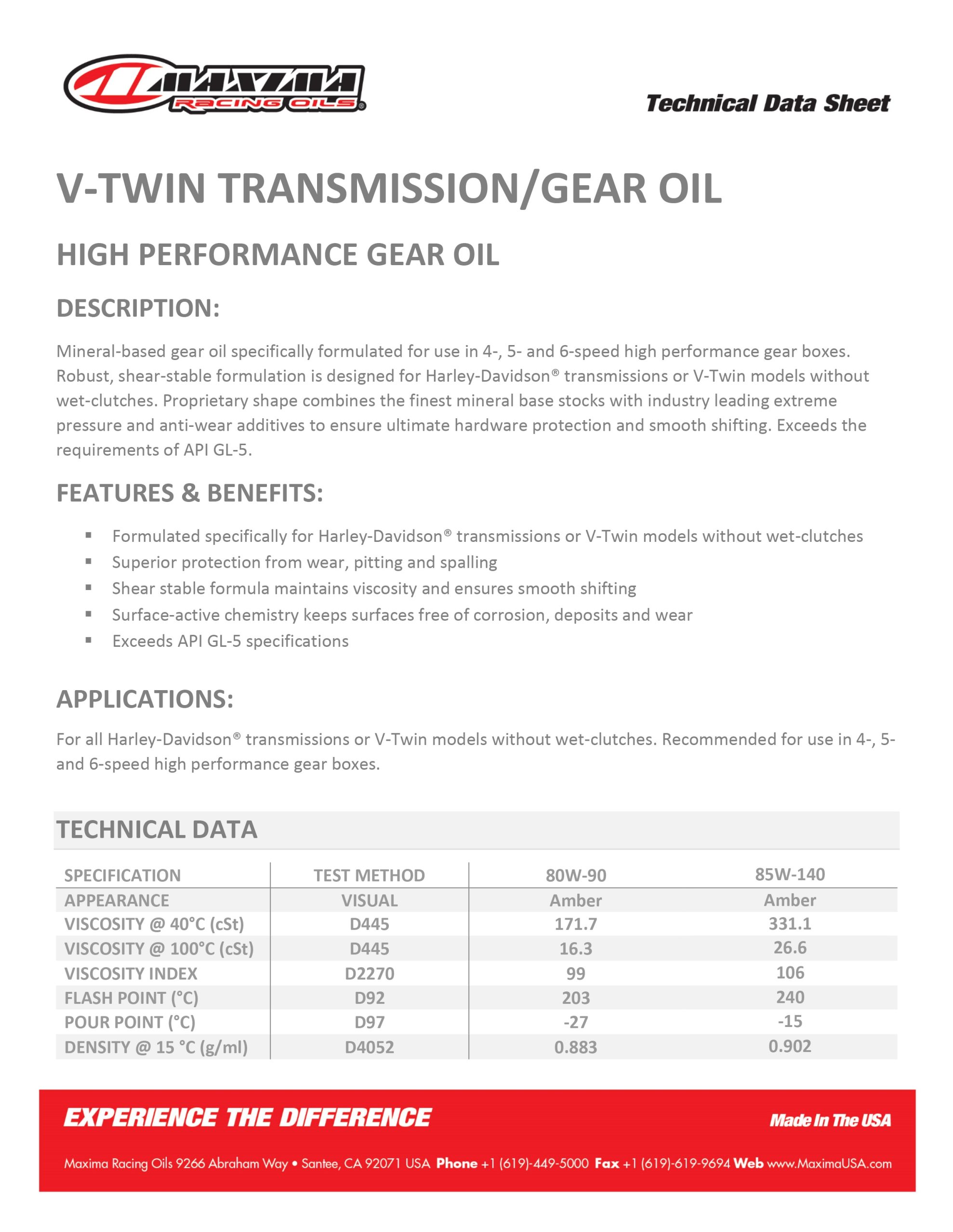 Mineral-based gear oil specifically formulated for use in 4-, 5- and 6-speed high performance gear boxes.