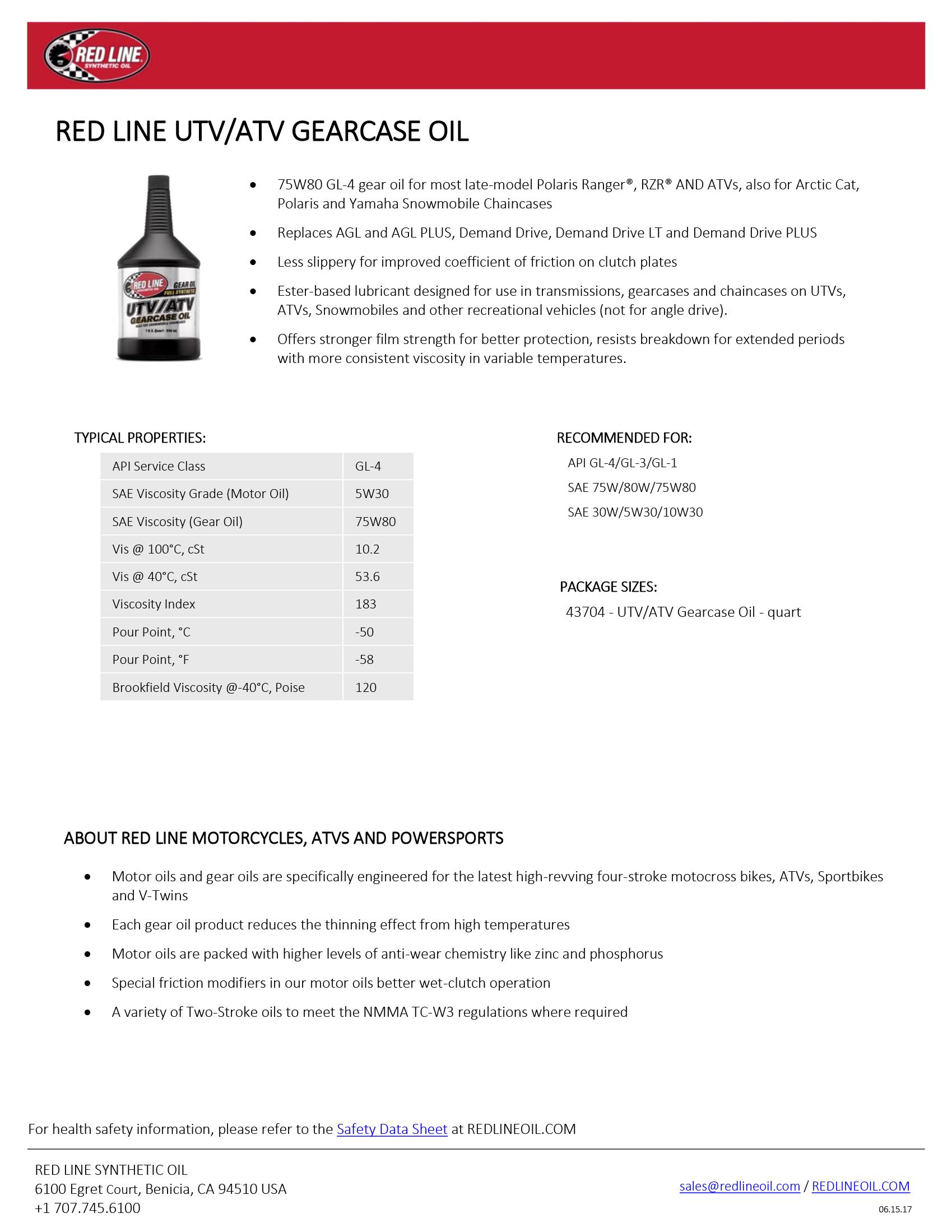 75W80 GL-4 gear oil is for most late-model Polaris Ranger®, RZR®, and ATVs, as well as Arctic Cat, Polaris, and Yamaha Snowmobile Chaincases.