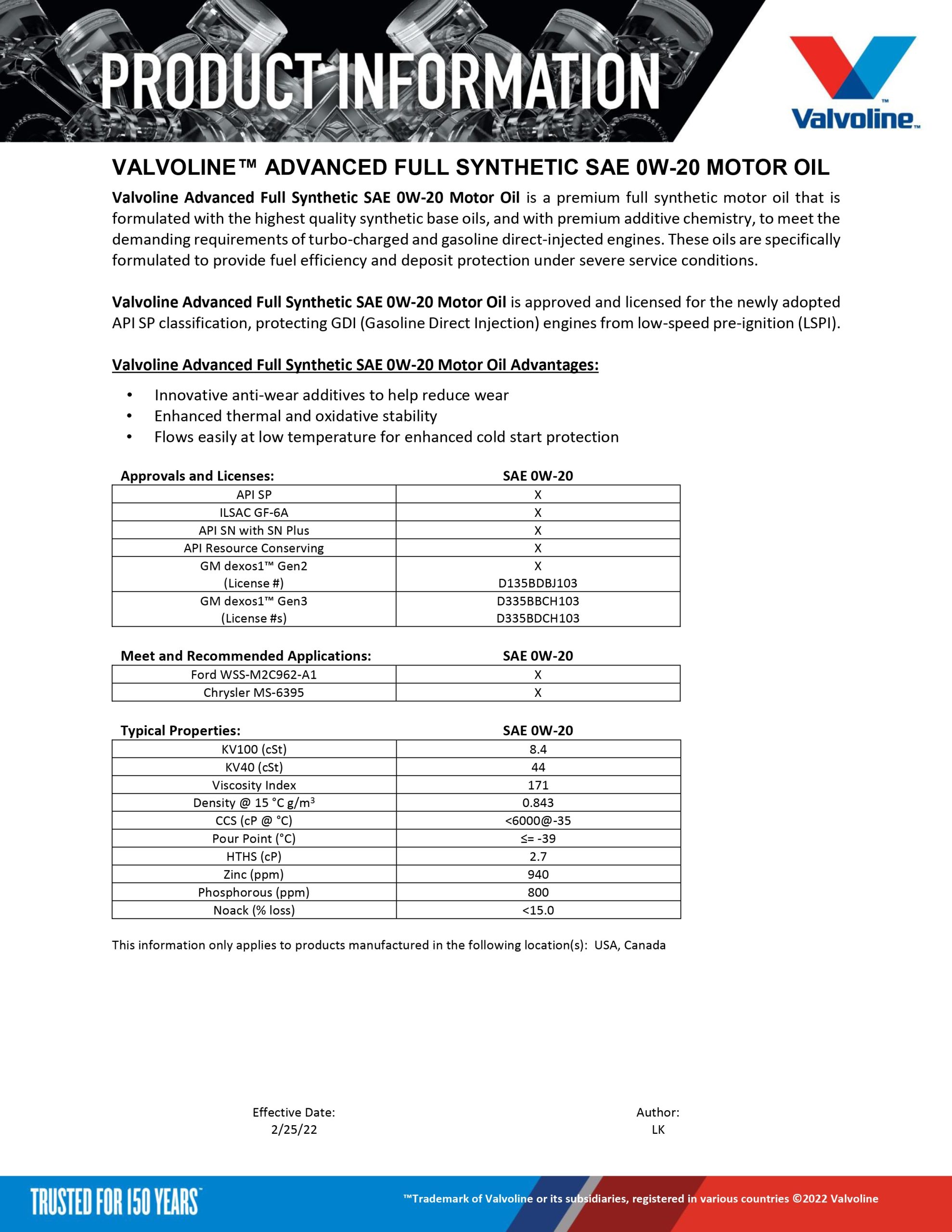 Valvoline Advanced Full Synthetic SAE 0W-20 Motor Oil is approved and licensed for the newly adopted API SP classification, protecting GDI (Gasoline Direct Injection) engines from low-speed pre-ignition (LSPI).