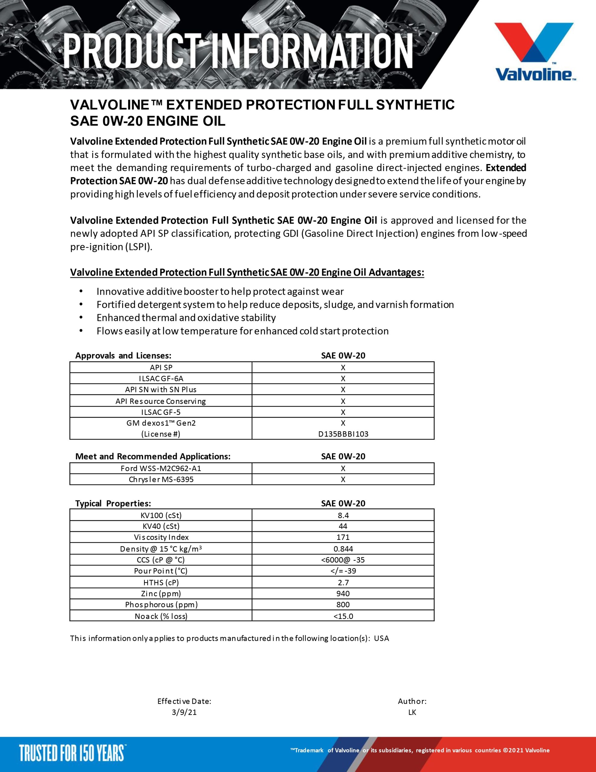 Valvoline Extended Protection Full Synthetic SAE 0W-20 Engine Oil is approved and licensed for the newly adopted API SP classification, protecting GDI (Gasoline Direct Injection) engines from low-speed pre-ignition (LSPI).