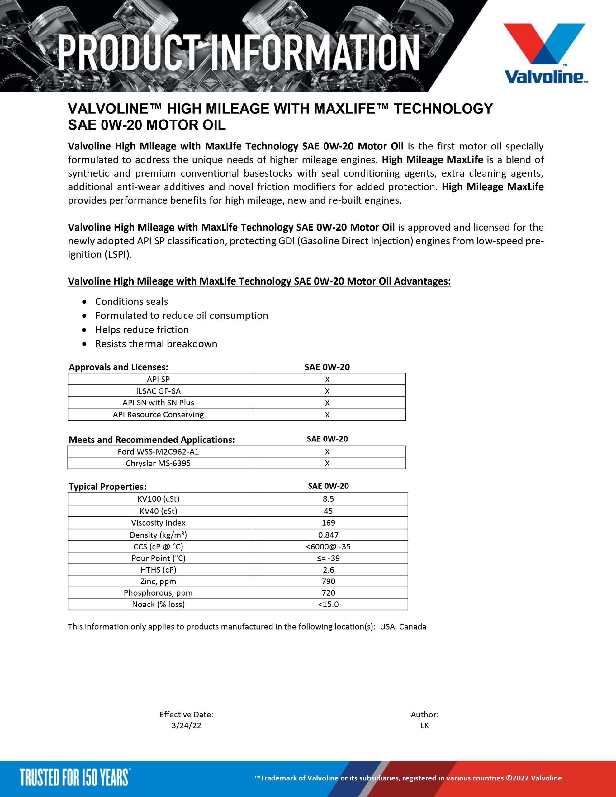 Valvoline High Mileage with MaxLife Technology SAE 0W-20 Motor Oil is the first motor oil specially formulated to address the unique needs of higher mileage engines.