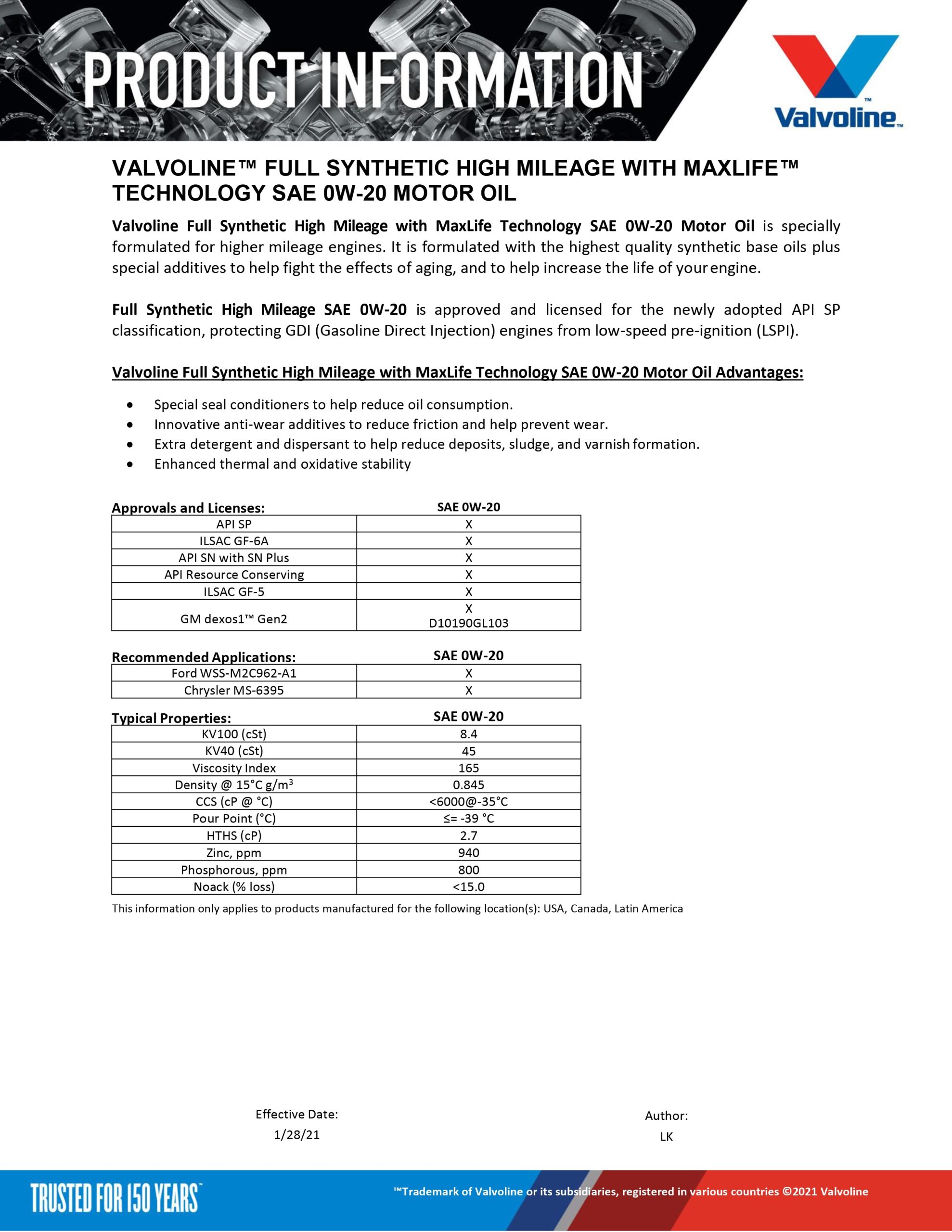 Valvoline Extended Protection Full Synthetic SAE 0W-20 Engine Oil is approved and licensed for the newly adopted API SP classification, protecting GDI (Gasoline Direct Injection) engines from low-speed pre-ignition (LSPI).