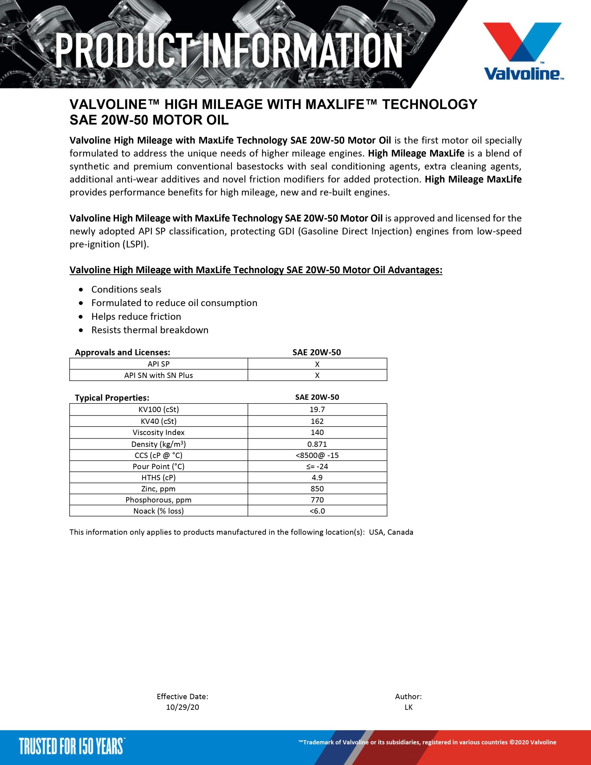 Valvoline High Mileage with MaxLife Technology SAE 20W-50 Motor Oil is the first motor oil specially formulated to address the unique needs of higher mileage engines.