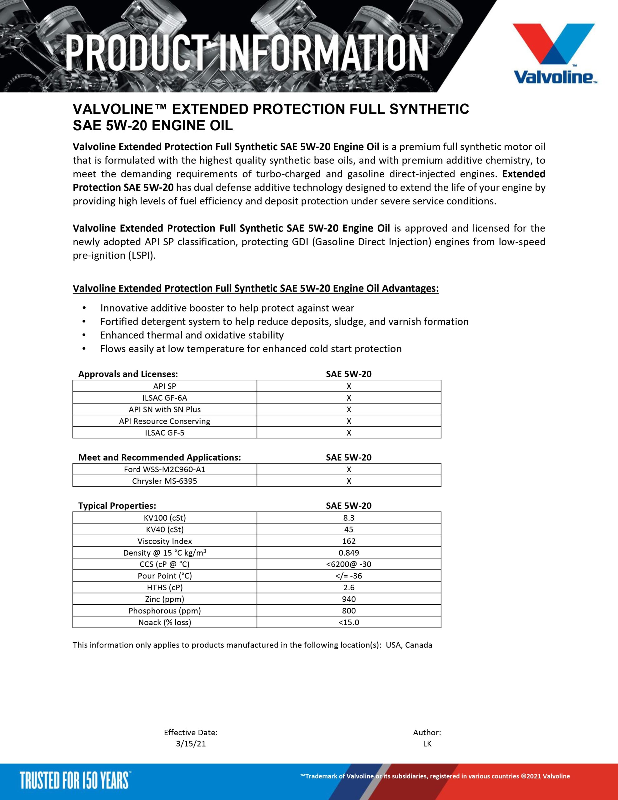 Valvoline Extended Protection Full Synthetic SAE 5W-20 Engine Oil is approved and licensed for the newly adopted API SP classification, protecting GDI (Gasoline Direct Injection) engines from low-speed pre-ignition (LSPI).
