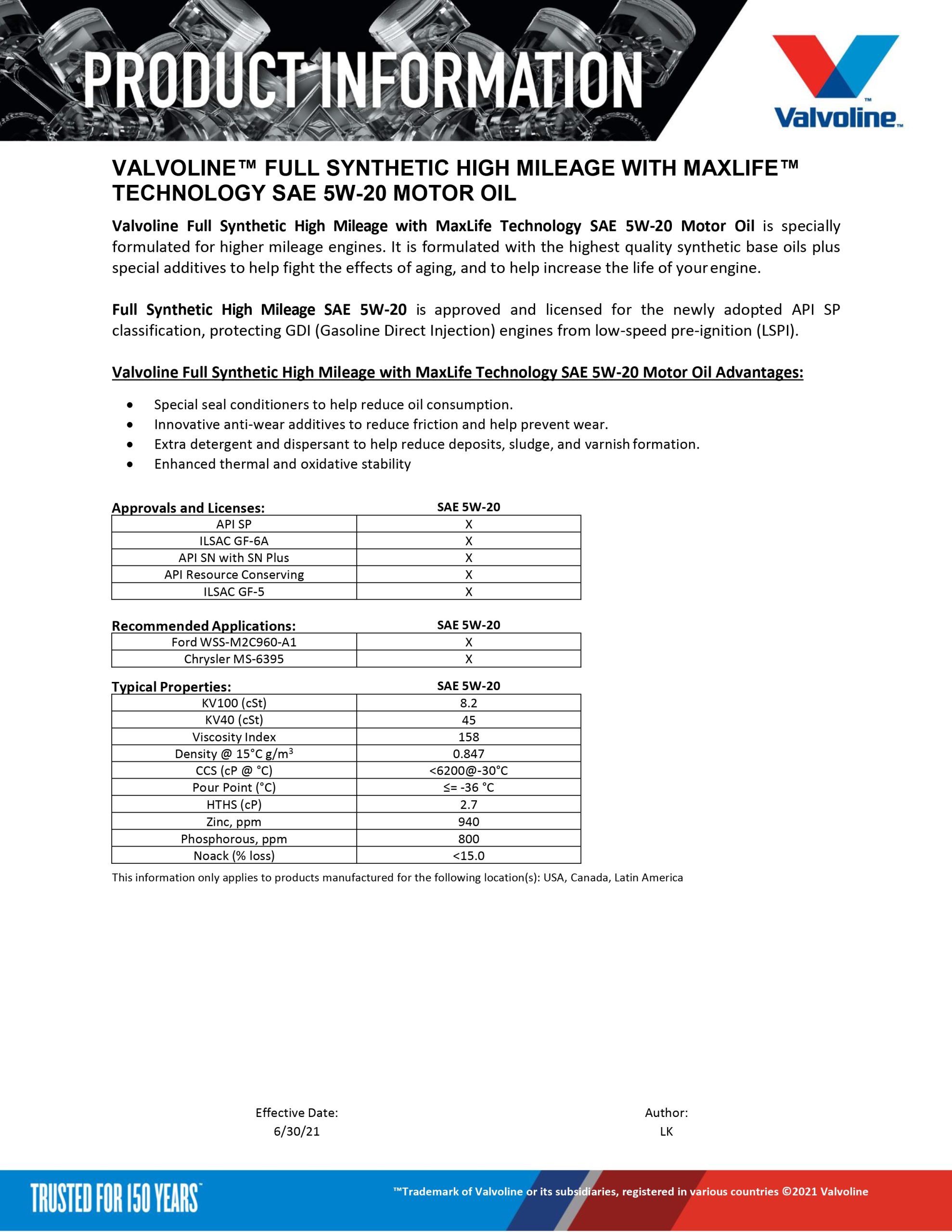 Valvoline Full Synthetic High Mileage with MaxLife Technology SAE 5W-20 Motor Oil is specially formulated for higher mileage engines.