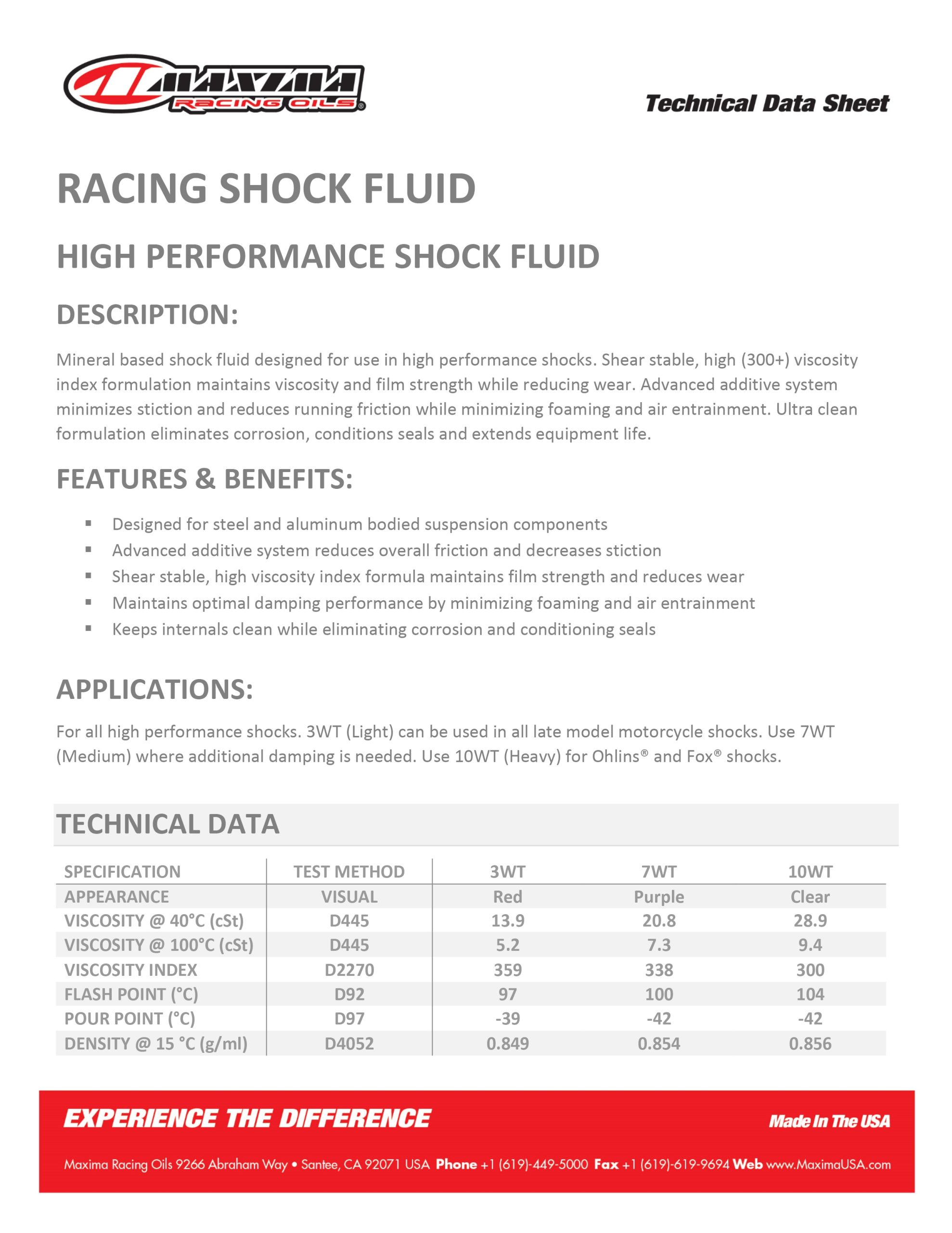 For all high performance shocks. 3WT (Light) can be used in all late model motorcycle shocks. Use 7WT (Medium) where additional damping is needed. Use 10WT (Heavy) for Ohlins® and Fox® shocks.