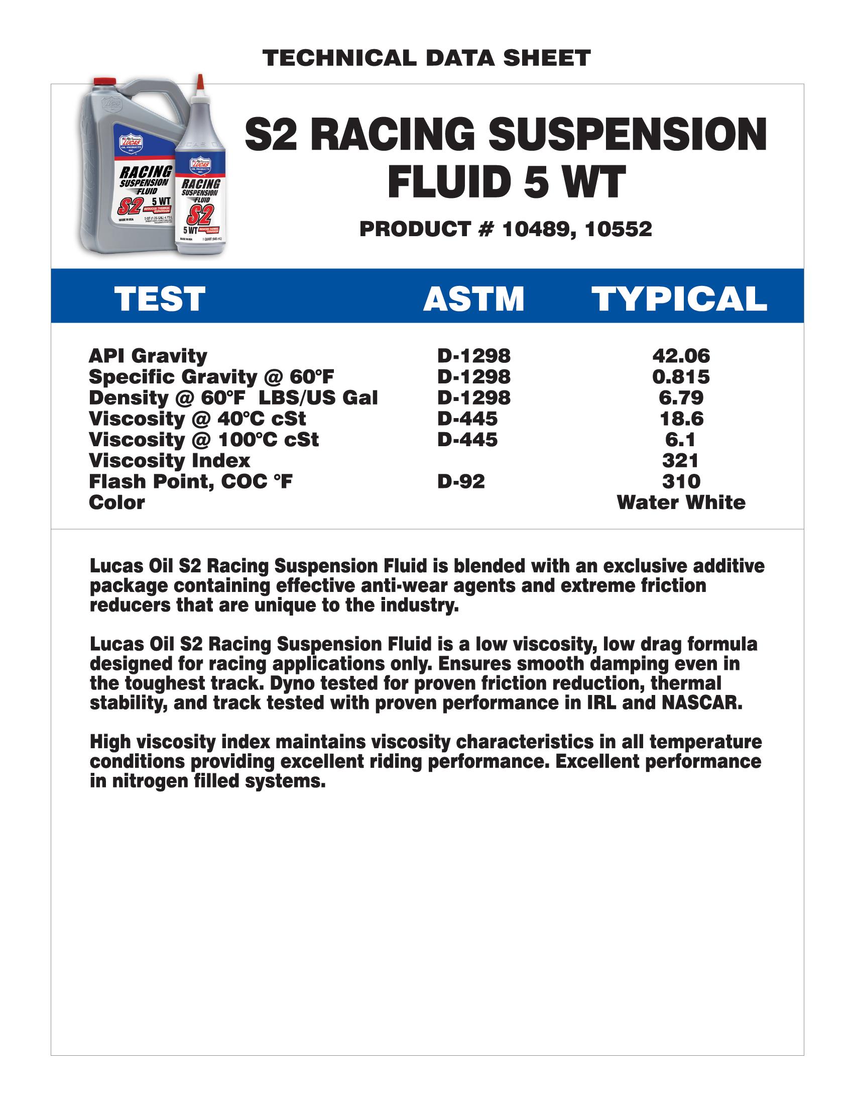 Lucas Oil Products developed S1 Racing Shock Oil to provide exceptional viscosity stability, anti-friction and anti-foam properties for use in all high performance suspension systems. Applications include off road racing shocks, motocross, supercross, conventional and upside down forks, circle track racing and more.