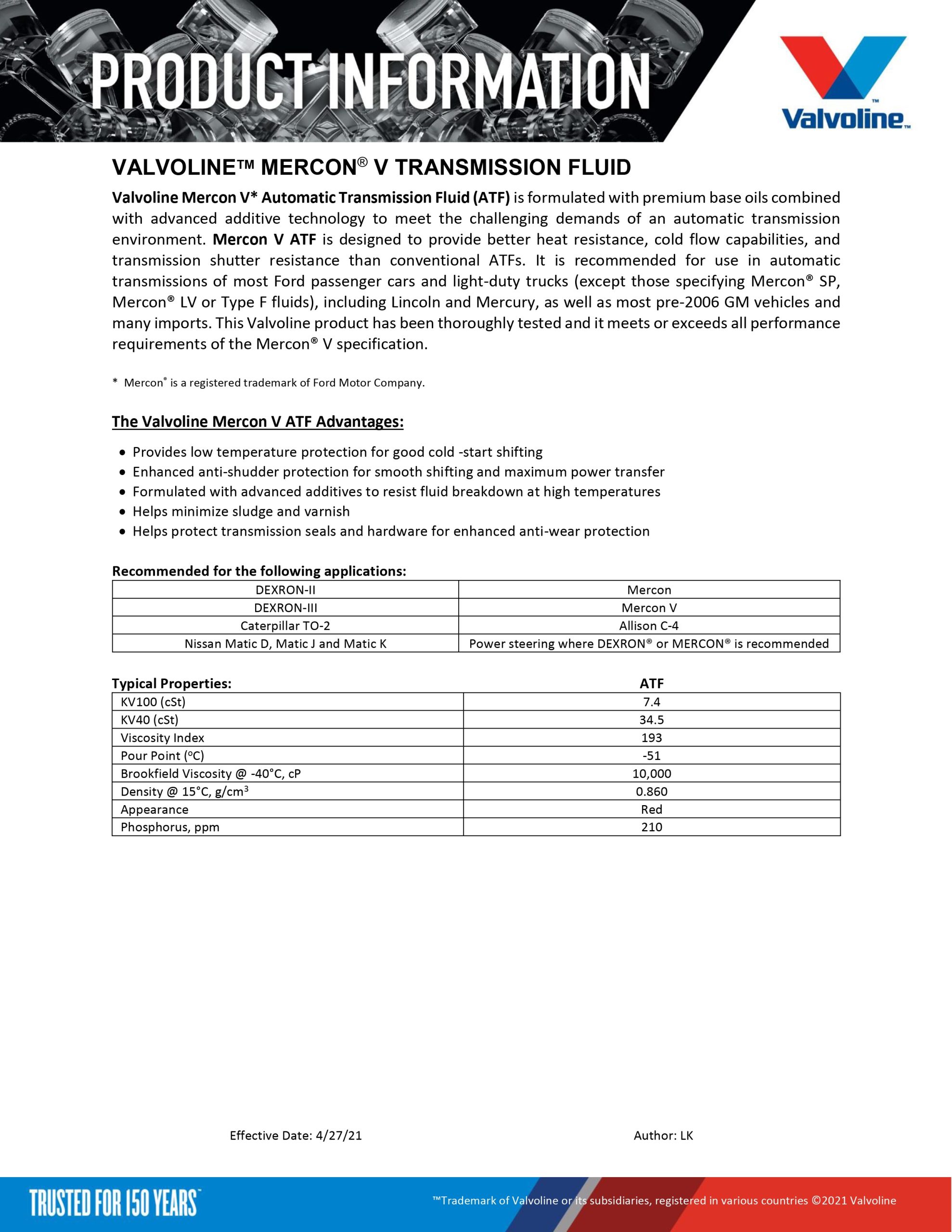 Valvoline Mercon V* Automatic Transmission Fluid (ATF) is formulated with premium base oils combined with advanced additive technology to meet the challenging demands of an automatic transmission environment.