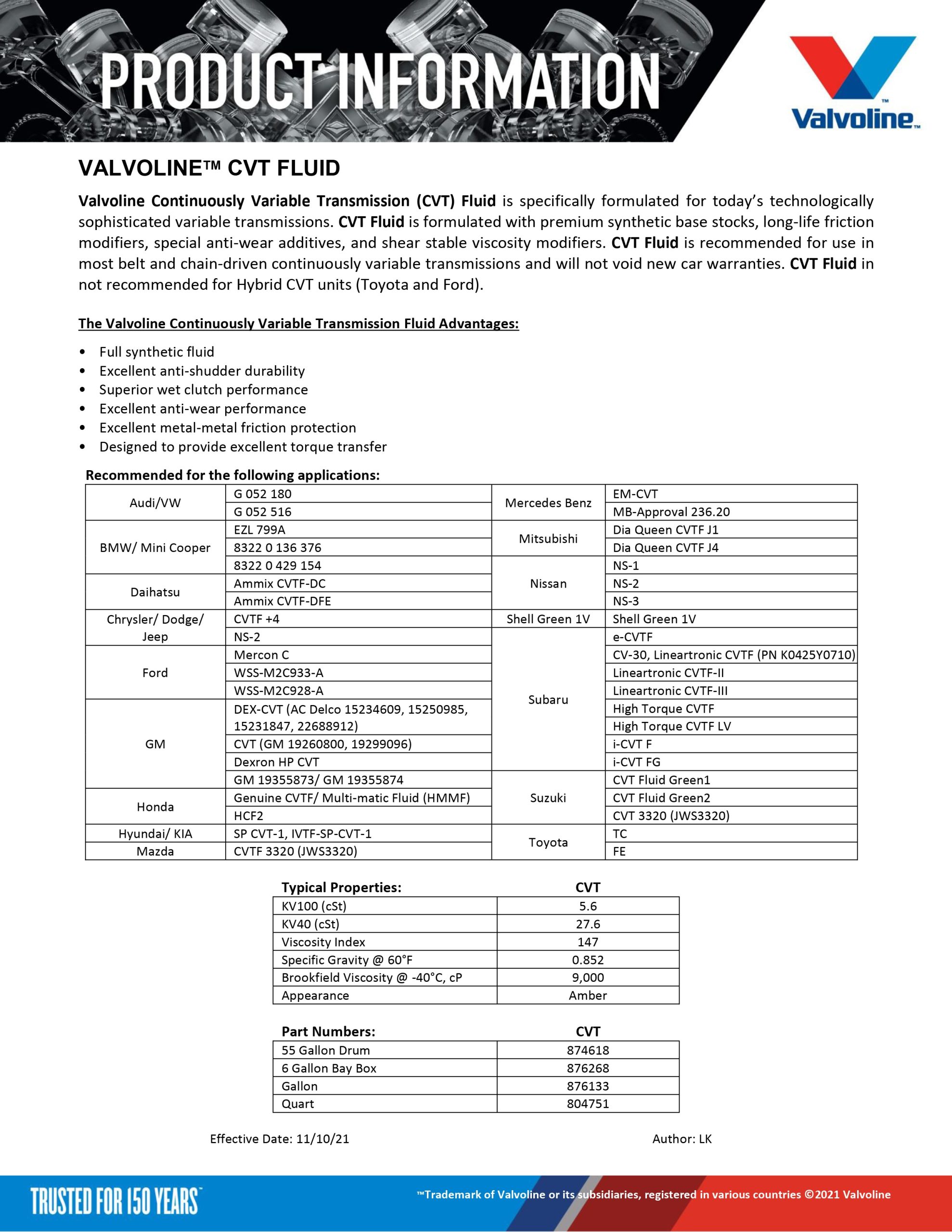 Valvoline Continuously Variable Transmission (CVT) Fluid is specifically formulated for todays technologically sophisticated variable transmissions.