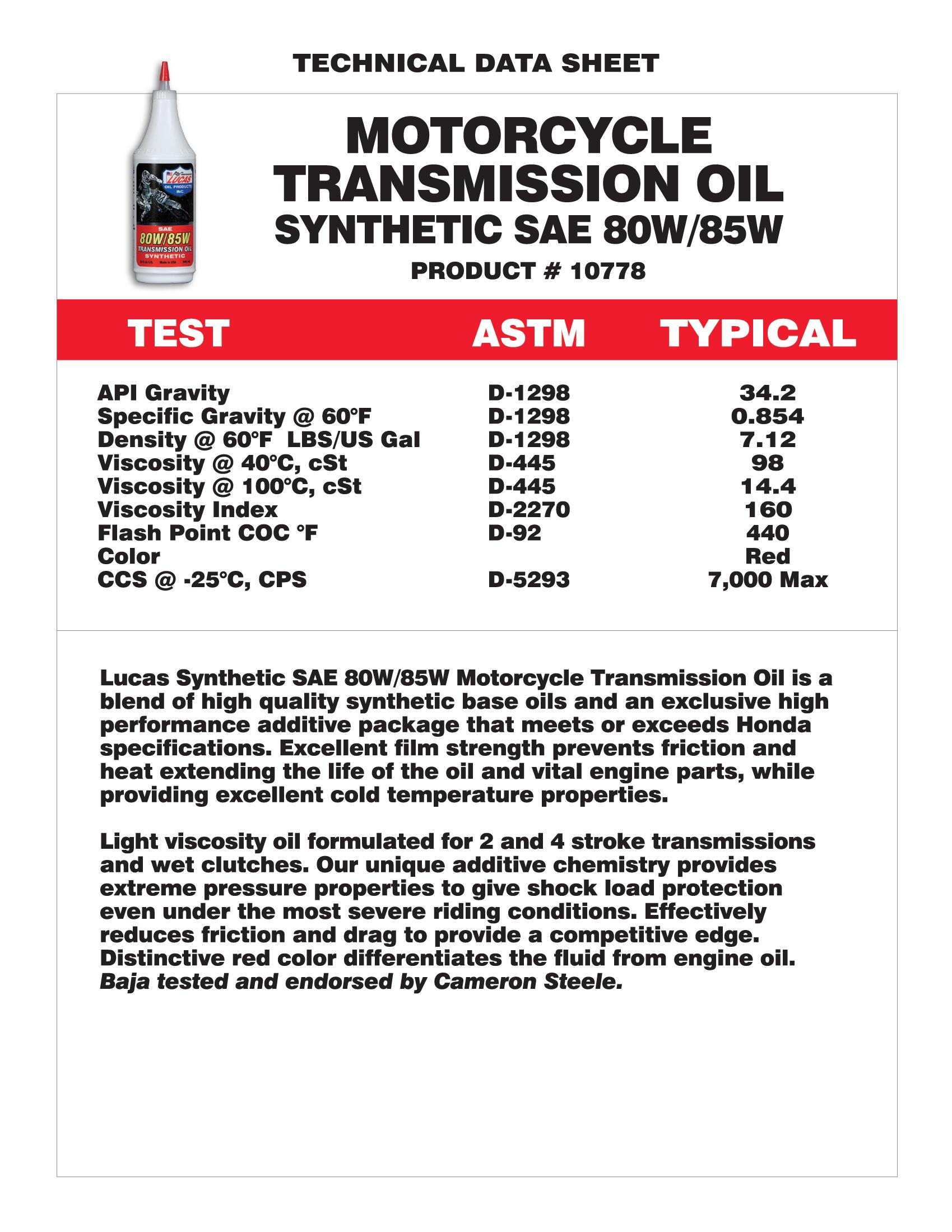 Lucas SAE 80W-85W Transmission Oil is formulated with an exclusive additive system that surpasses or equals OEM grade oils and is used by pro AMA teams and riders.