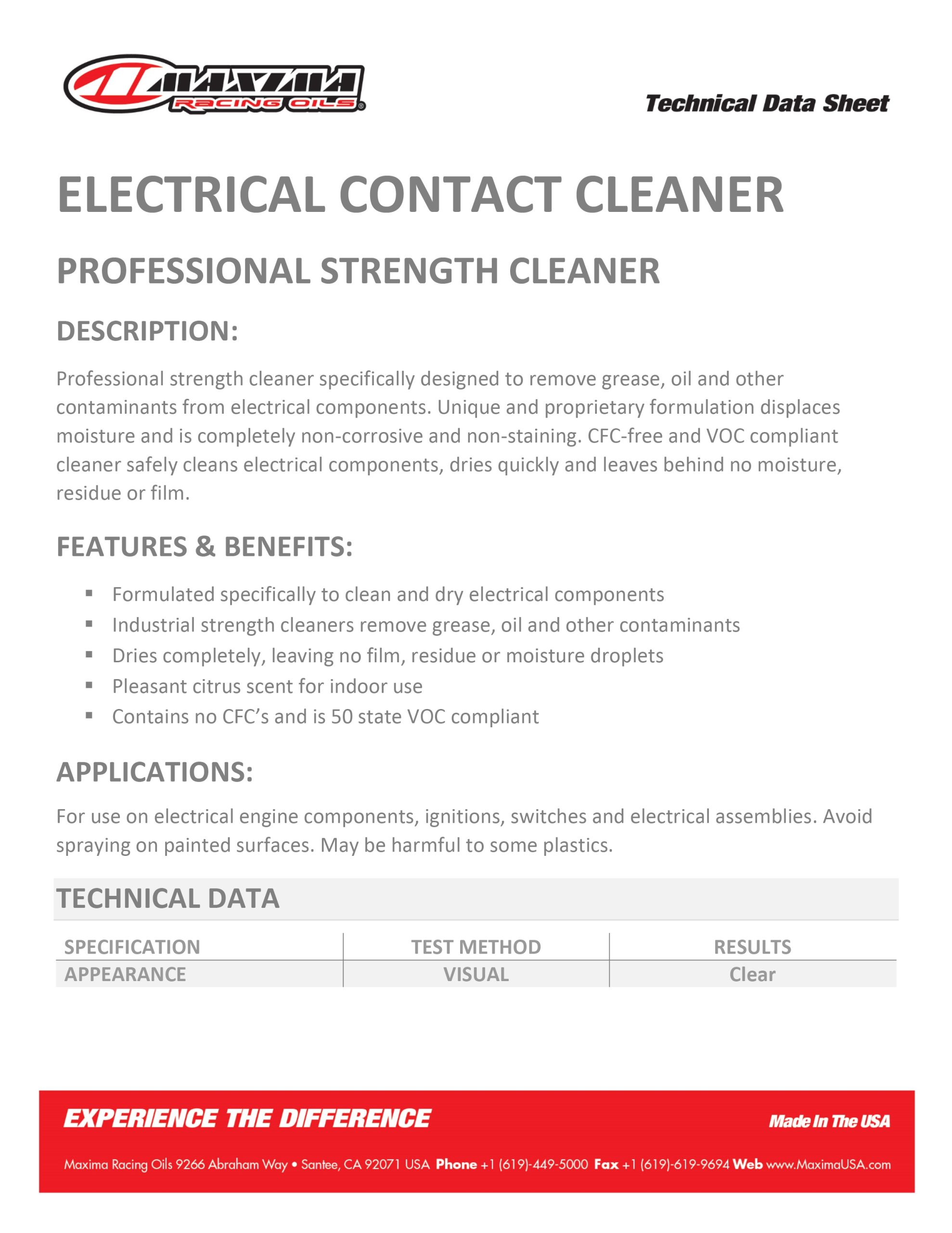 Professional strength cleaner specifically designed to remove grease, oil and other contaminants from electrical components.