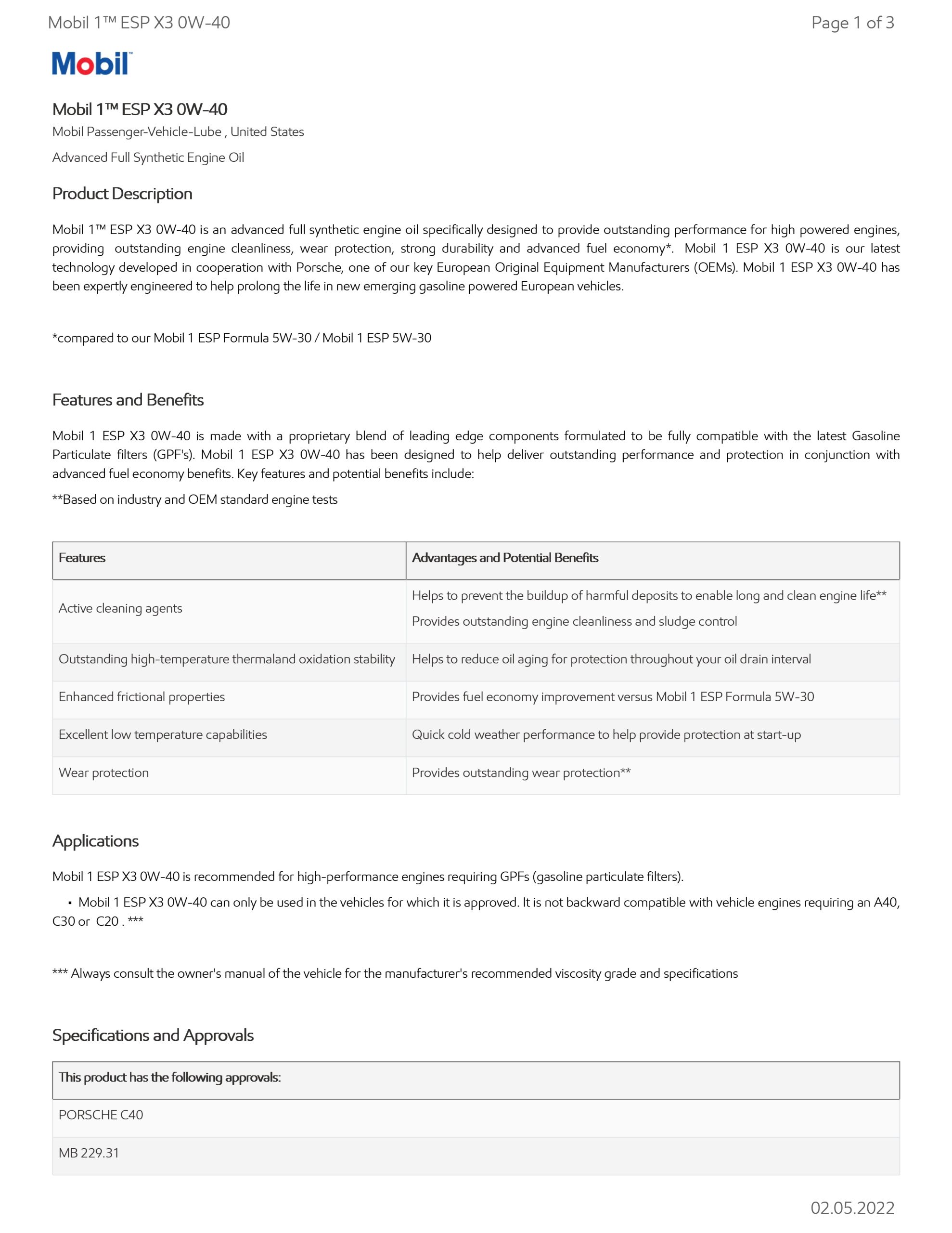 Mobil 1 ESP X3 0W-40 has been expertly engineered to help prolong the life in new emerging gasoline powered European vehicles.