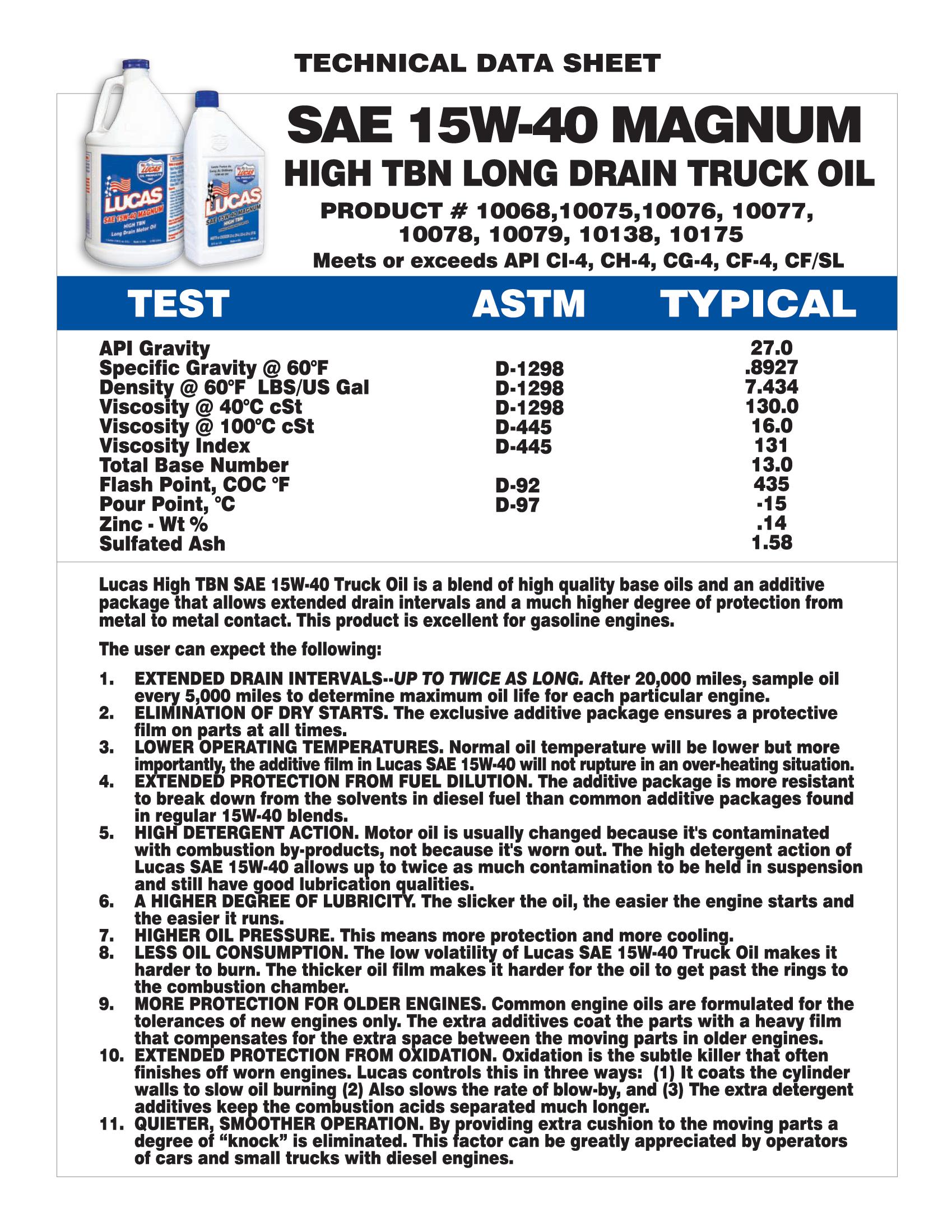 Lucas 15W-40 Magnum High TBN CI-4 Oil is a blend of high quality base oils and an additive package that allows extended drain intervals and a much higher degree of protection from metal to metal contact.