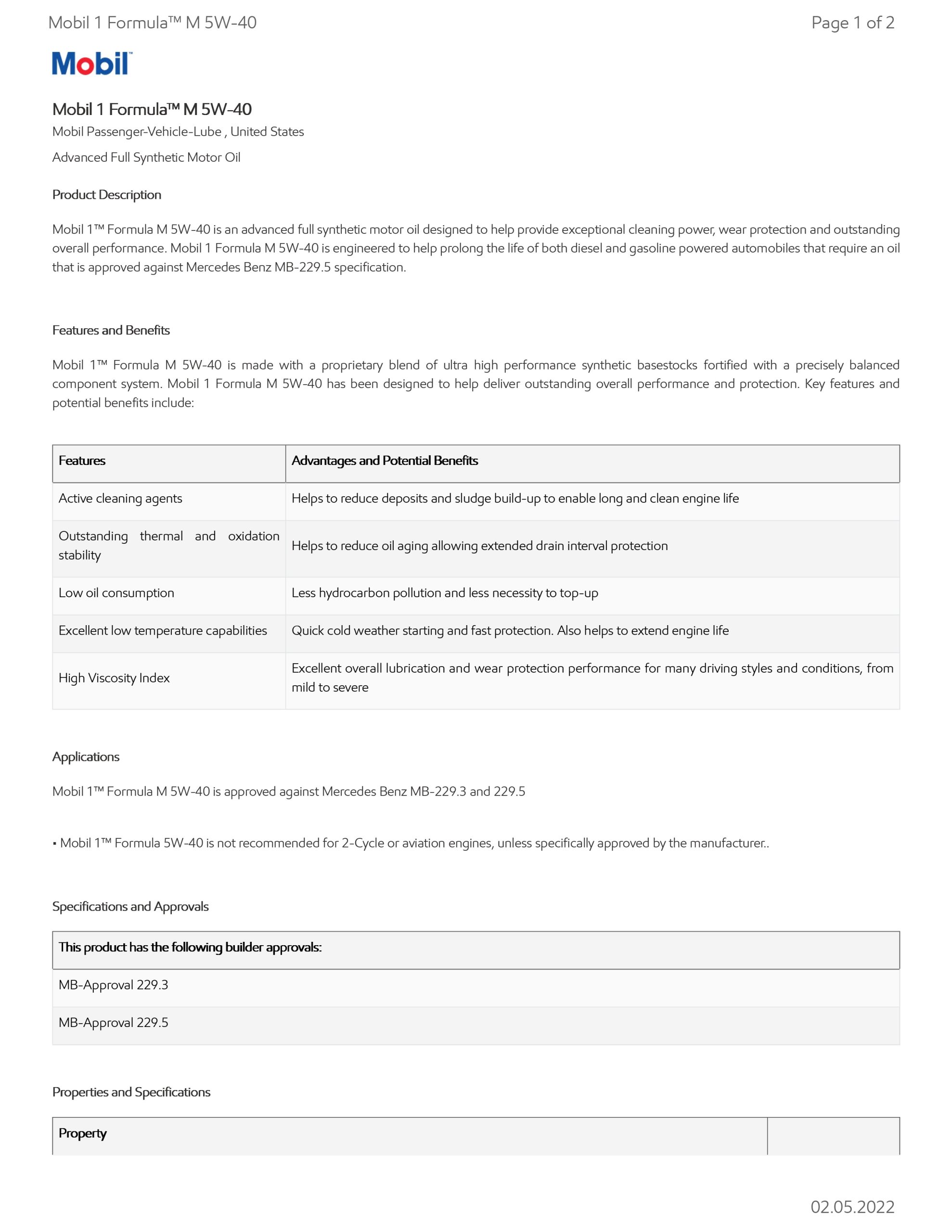 Mobil 1 Formula M 5W-40 is engineered to help prolong the life of both diesel and gasoline powered automobiles that require an oil that is approved against Mercedes Benz MB-229.5 specification.