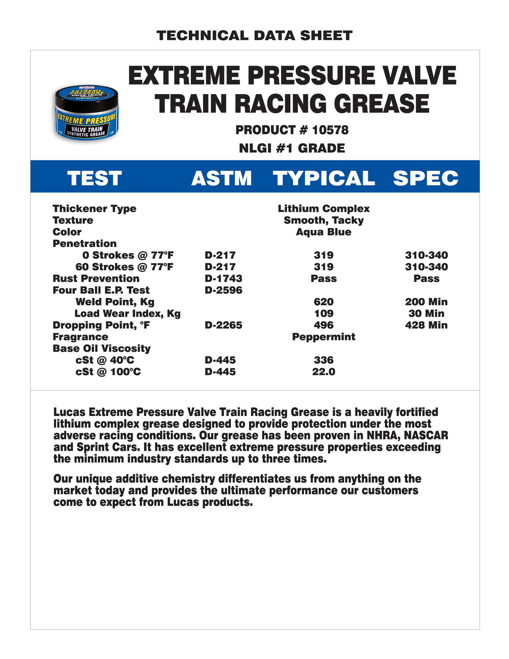 Extreme Pressure Valve Train Synthetic Grease contains special bonding agents that create a powerful lubricant film between moving metal surfaces. This film can withstand extreme heat and mechanical pressure to keep metal parts separated, protecting them from scoring and seizing.
