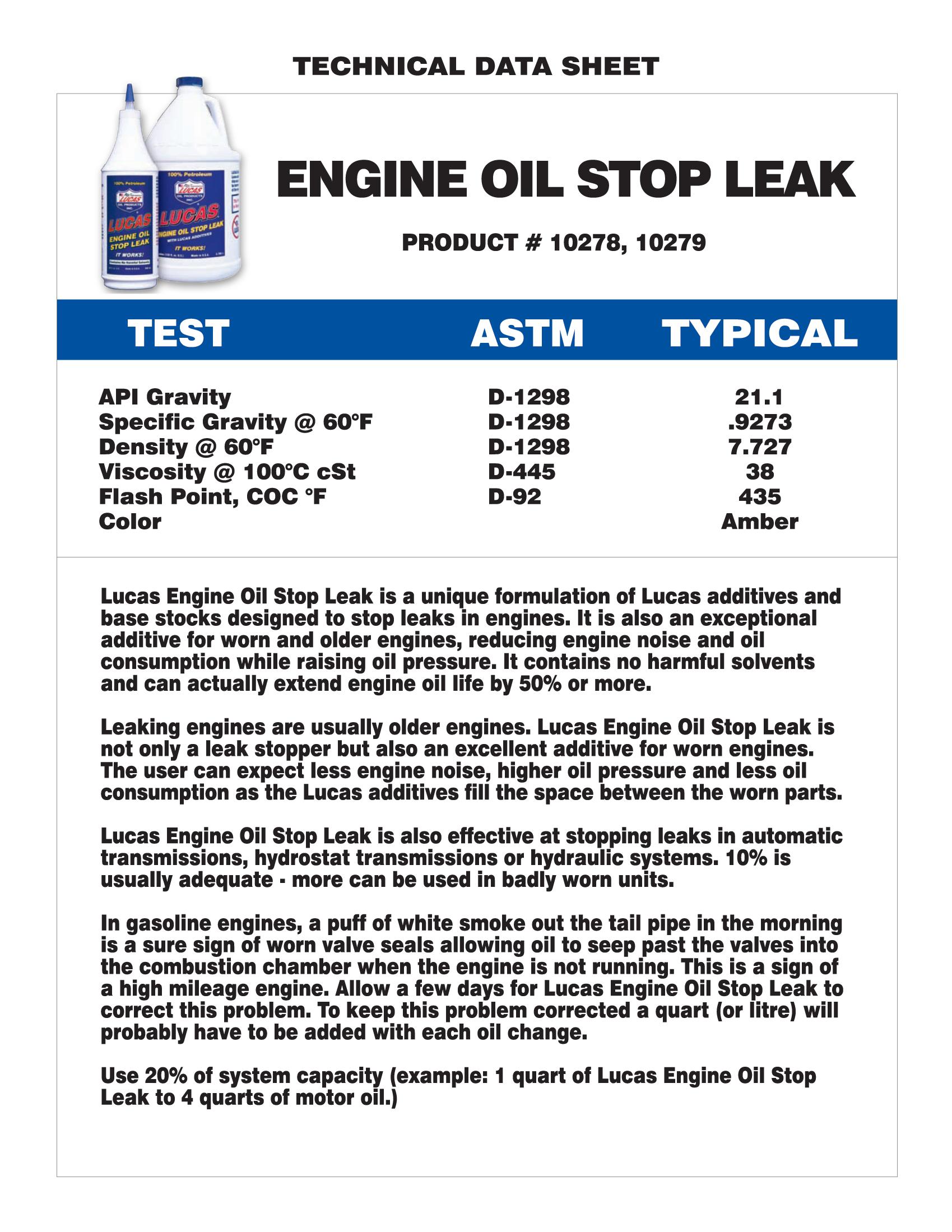 Lucas Engine Oil Stop Leak is an all new formulation of Lucas additives and very specific base stocks designed to stop seal leaks in engines.