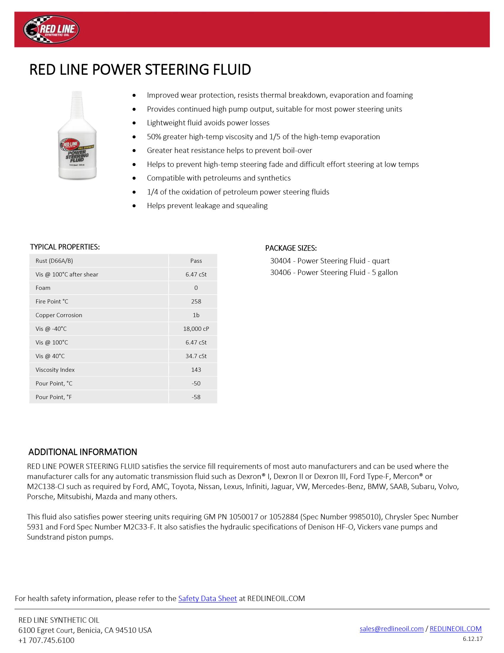 Red Line Power Steering Fluid has much better thermal and oxidation resistance compared to petroleum power steering fluids and is capable of use at higher temperatures and will improve low temperature steering compared to most factory fluids.