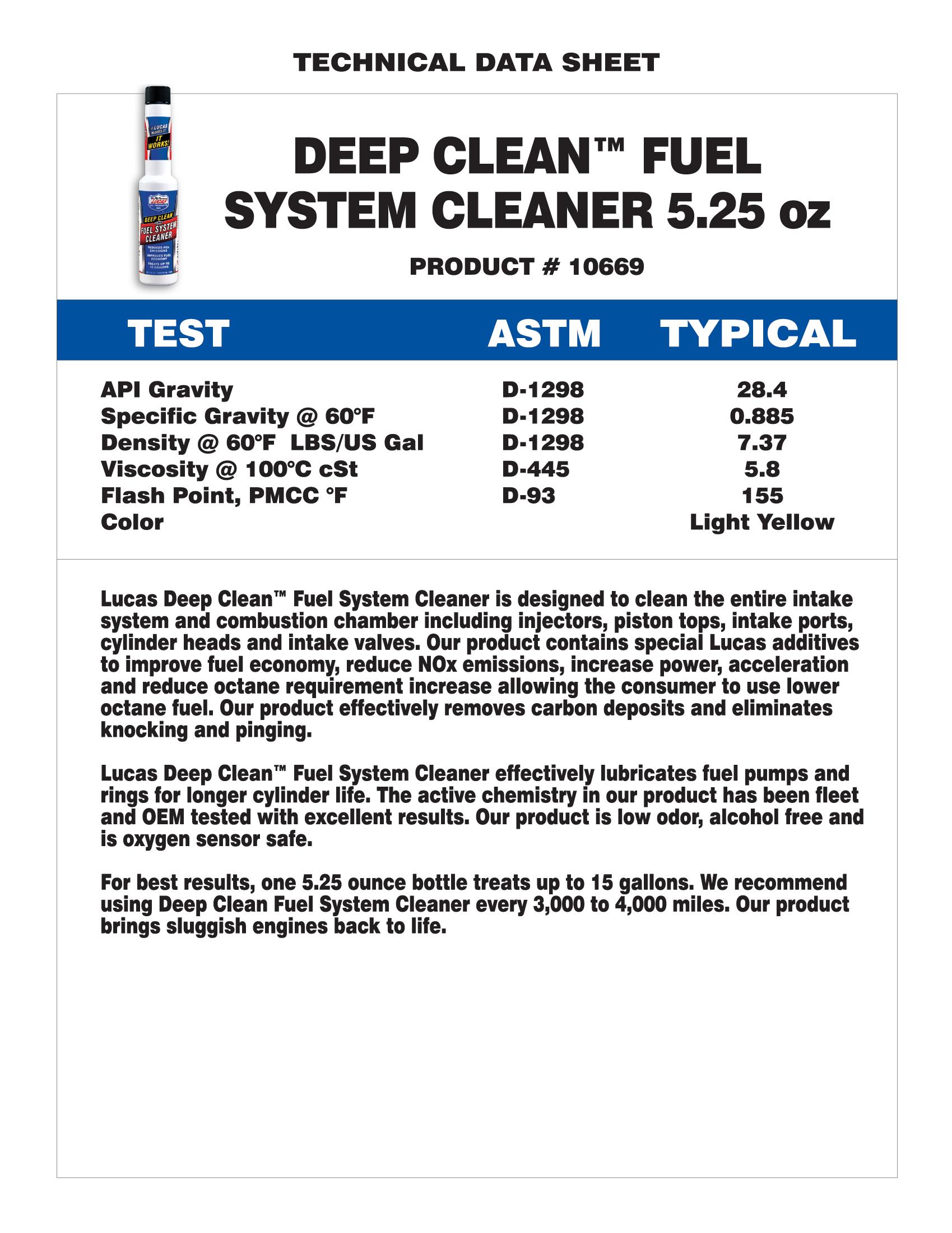 Lucas Deep Clean Fuel System Cleaner is blended with an exclusive Lucas additive package and specific carrier fluid that contains no diesel fuel, kerosene or anything else that can be harmful or useless to an engine. It also reduces NOx emissions, eliminates the need for higher octane fuel and deep cleans the entire fuel system and combustion chamber.