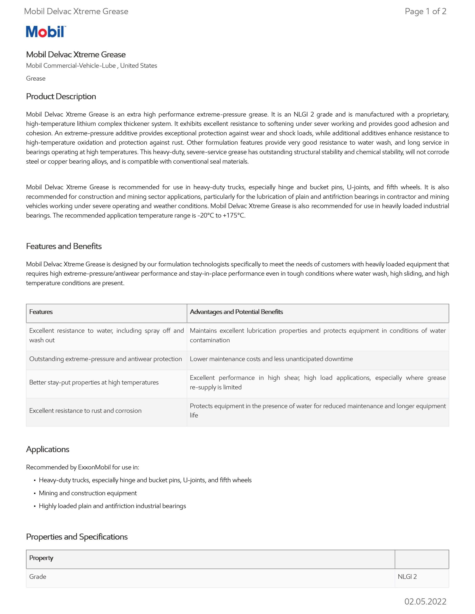 Mobil Delvac Xtreme Grease is an extra high performance extreme-pressure grease. It is an NLGI#2 grade and is manufactured with a proprietary, high-temperature lithium complex thickener system.