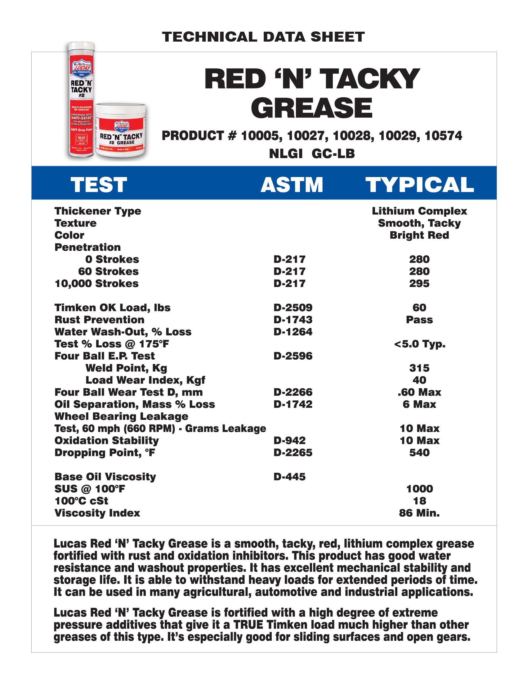 Lucas Red ‘N’ Tacky Grease is a smooth, tacky, red lithium complex grease fortified with rust and oxidation inhibitors. It has good water resistance and washout properties. It has excellent mechanical stability and storage life. It is able to withstand heavy loads for extended periods of time. It can be used in many agricultural, automotive and industrial applications.