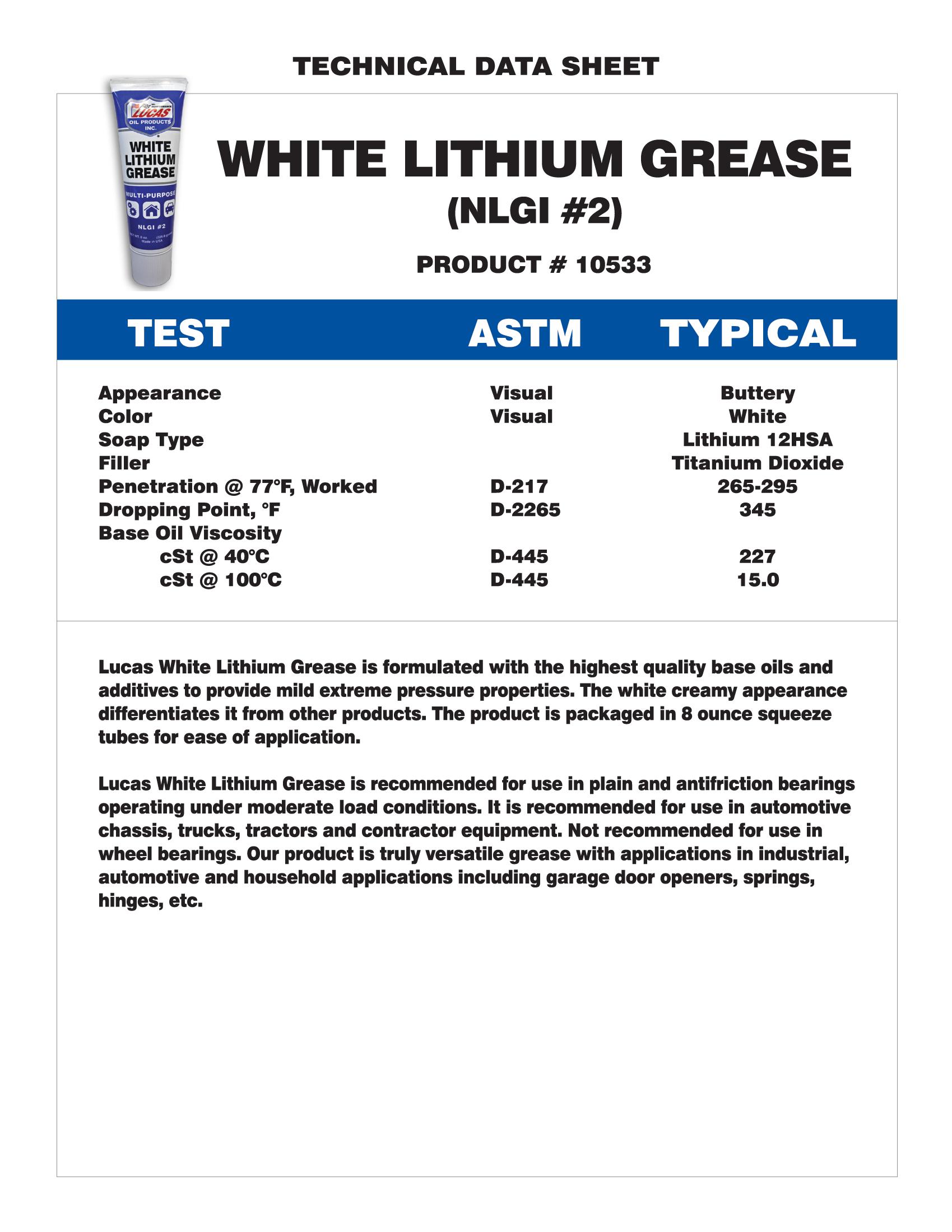 Lucas White Lithium Grease is a Multi-Purpose high quality NLGI #2 formulation. White and creamy in appearance, the White Lithium Grease resist extreme pressure properties and is recommended for everything from household applications, to a variety of automotive uses including chassis, trucks, tractors, and contractor equipment.