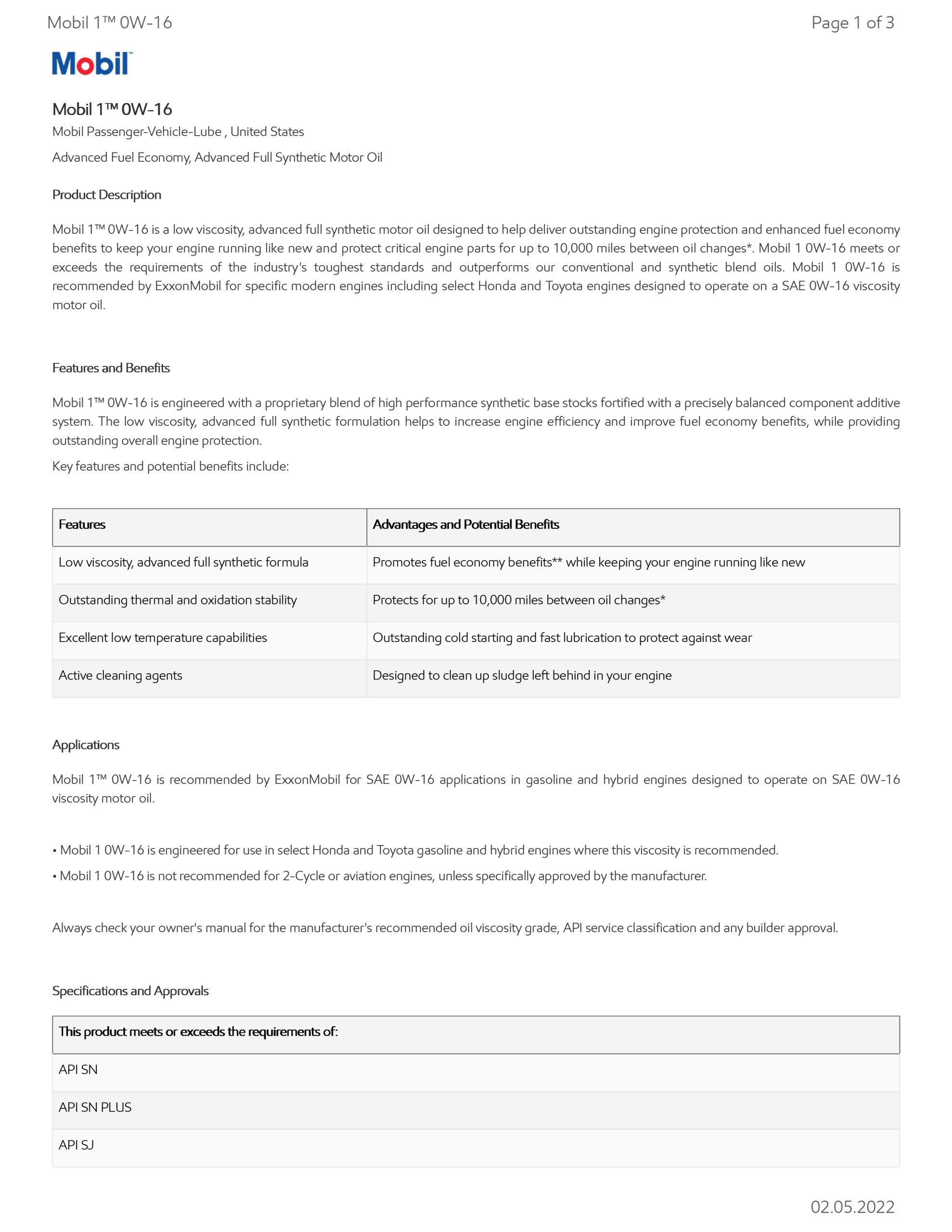Mobil 1™ 0W-16 is recommended by ExxonMobil for SAE 0W-16 applications in gasoline and hybrid engines designed to operate on SAE 0W-16 viscosity motor oil.