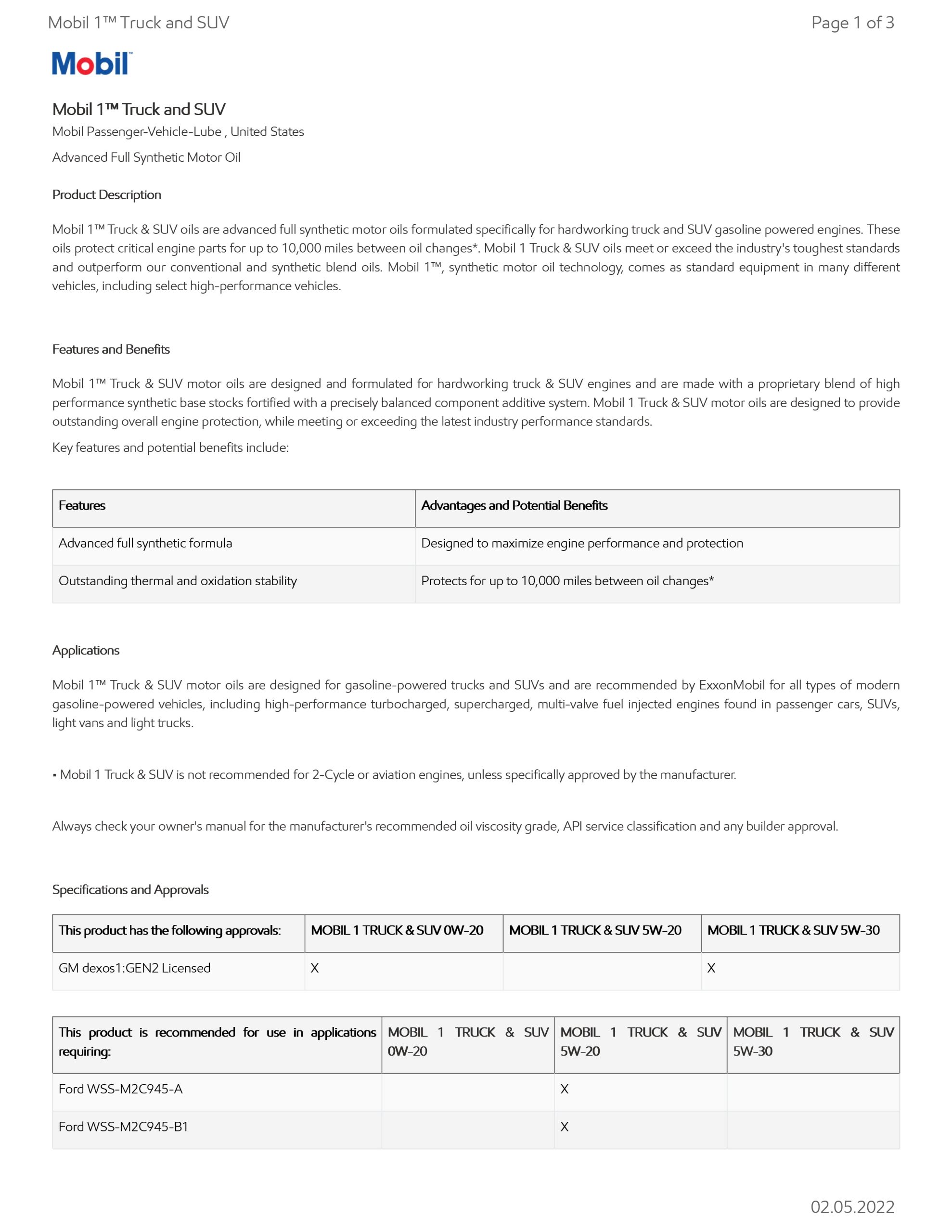 Mobil 1 Truck & SUV is not recommended for 2-Cycle or aviation engines, unless specifically approved by the manufacturer.