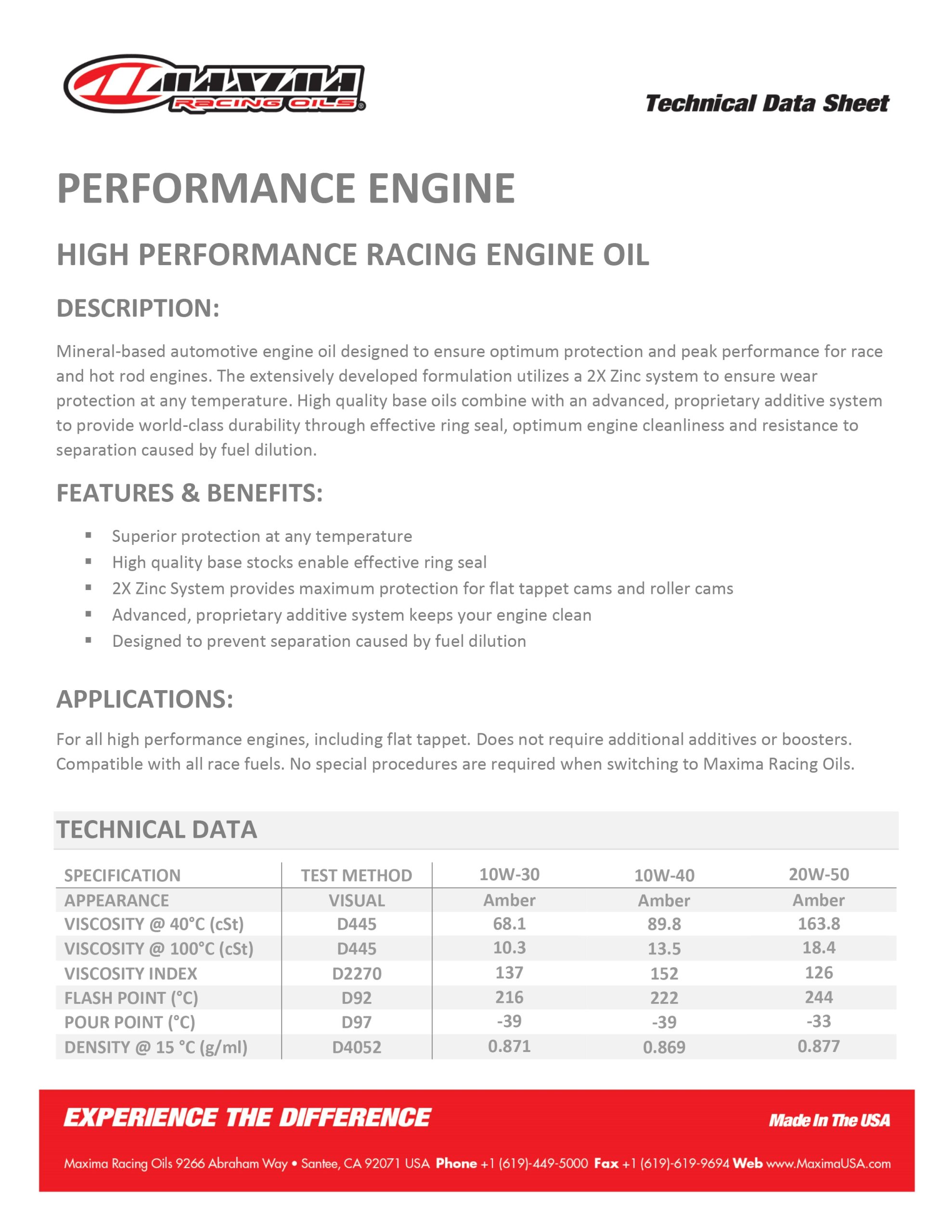 For all high performance engines, including flat tappet. Does not require additional additives or boosters. Compatible with all race fuels. No special procedures are required when switching to Maxima Racing Oils.
