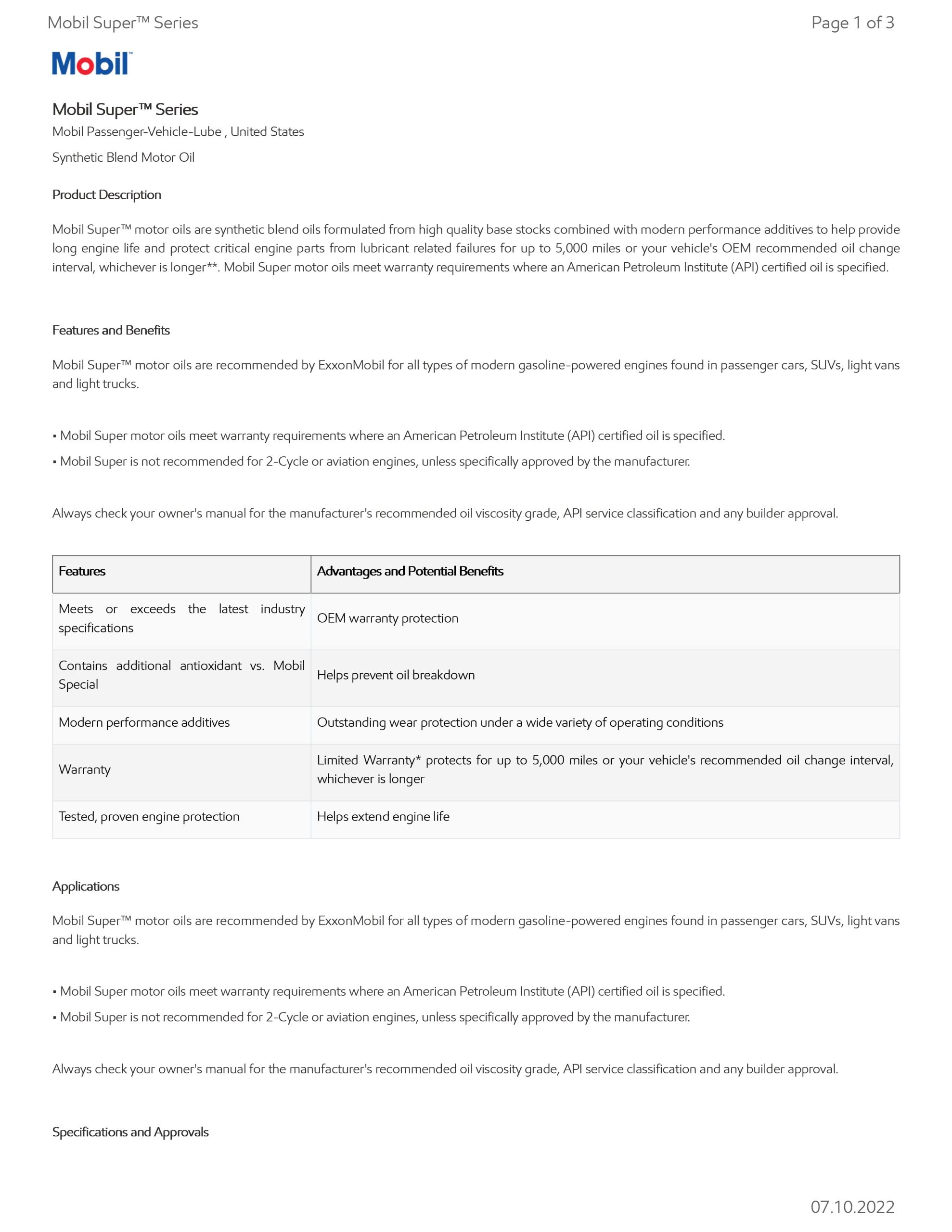 - Mobil Super motor oils meet warranty requirements where an American Petroleum Institute (API) certified oil is specified.