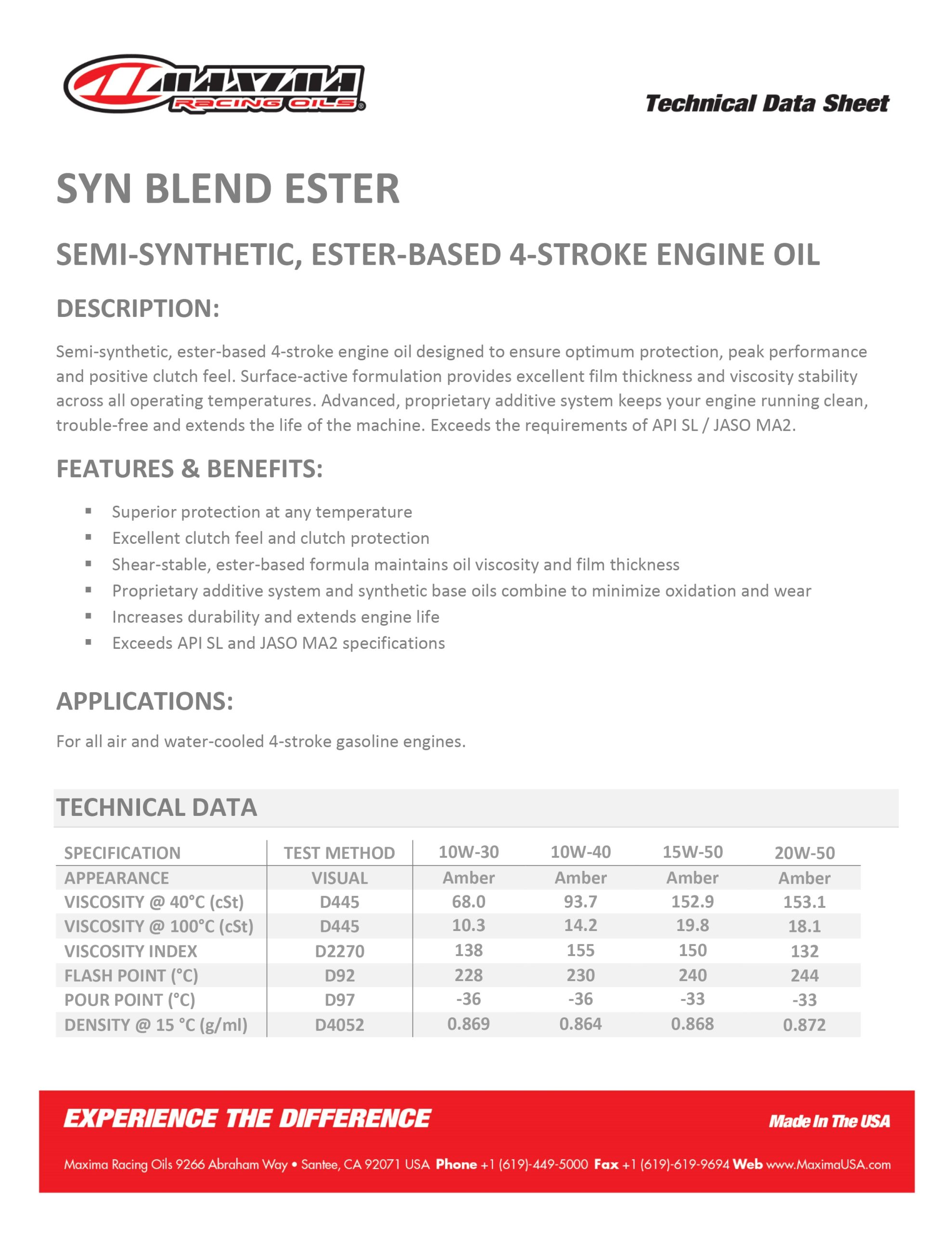 - Shear-stable, ester-based formula maintains oil viscosity and film thickness.