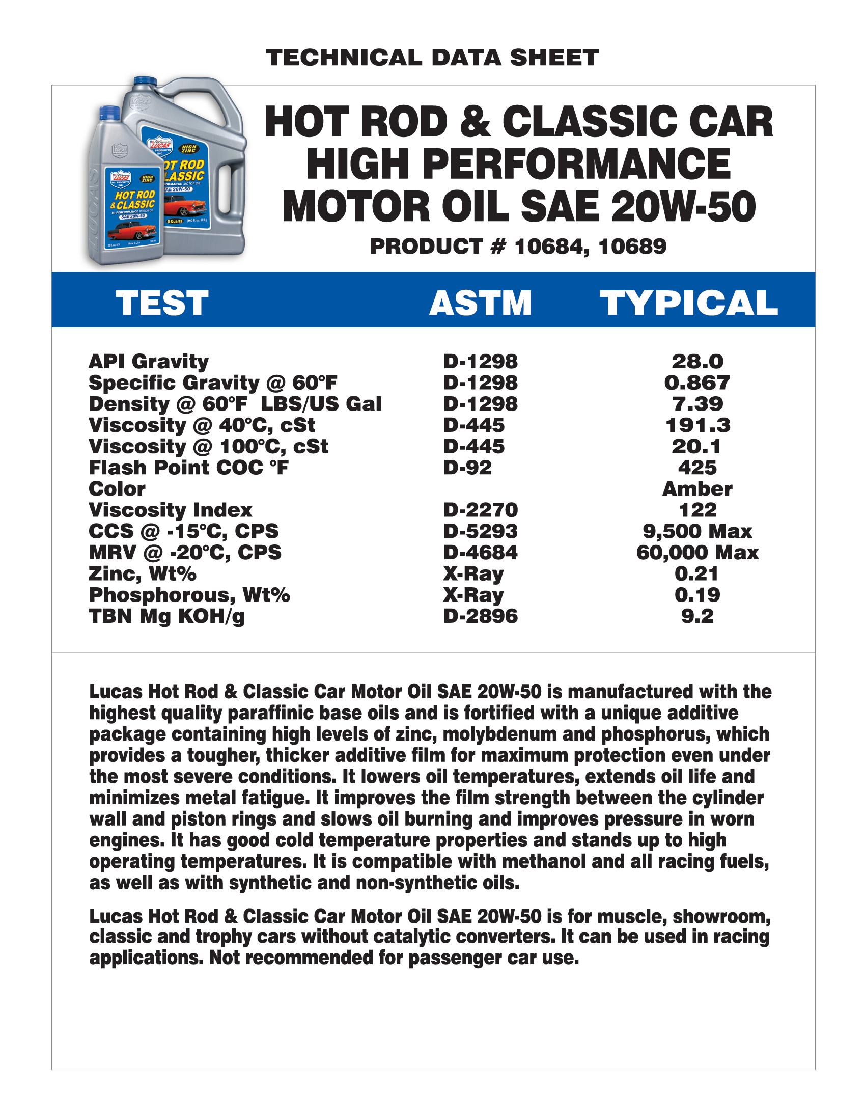Lucas Hot Rod & Classic Car Motor Oil SAE 20W-50 is manufactured with the highest quality paraffinic base oils and is fortified with a unique additive package containing high levels of zinc, molybdenum and phosphorus, which provides a tougher, thicker additive film for maximum protection even under the most severe conditions.